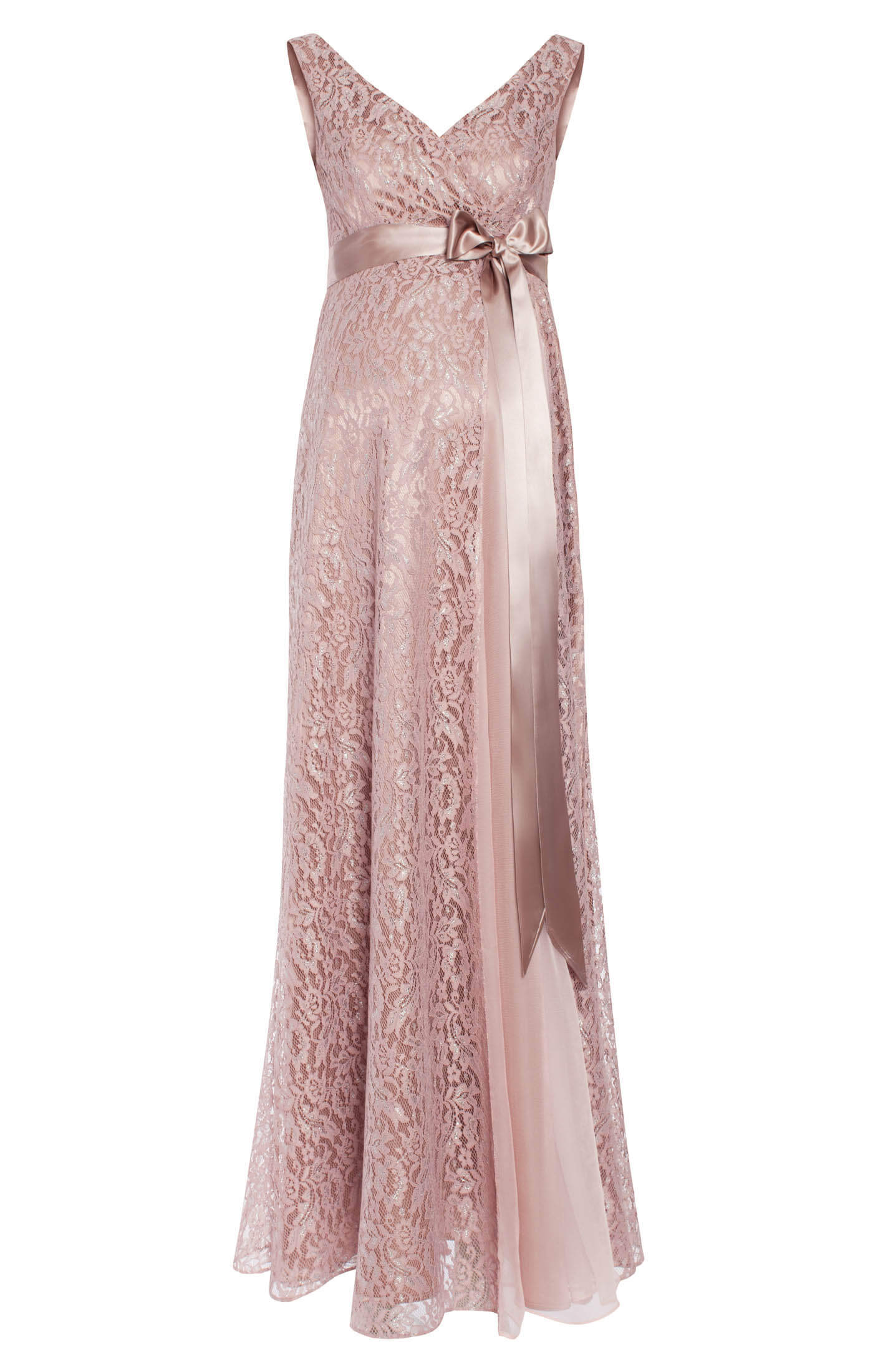Full of glamour and romance, Thea long maternity gown is so feminine, with its delicate pink lace and hint of shimmering silver. Just perfect when you want to make a dramatic entrance.