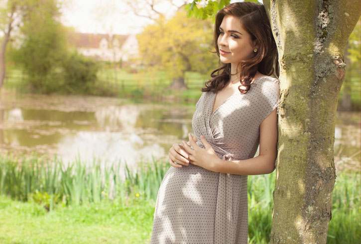 Go dotty for the versatile pattern of our Alessandra Polka Dot maternity gown, perfect for a garden party.