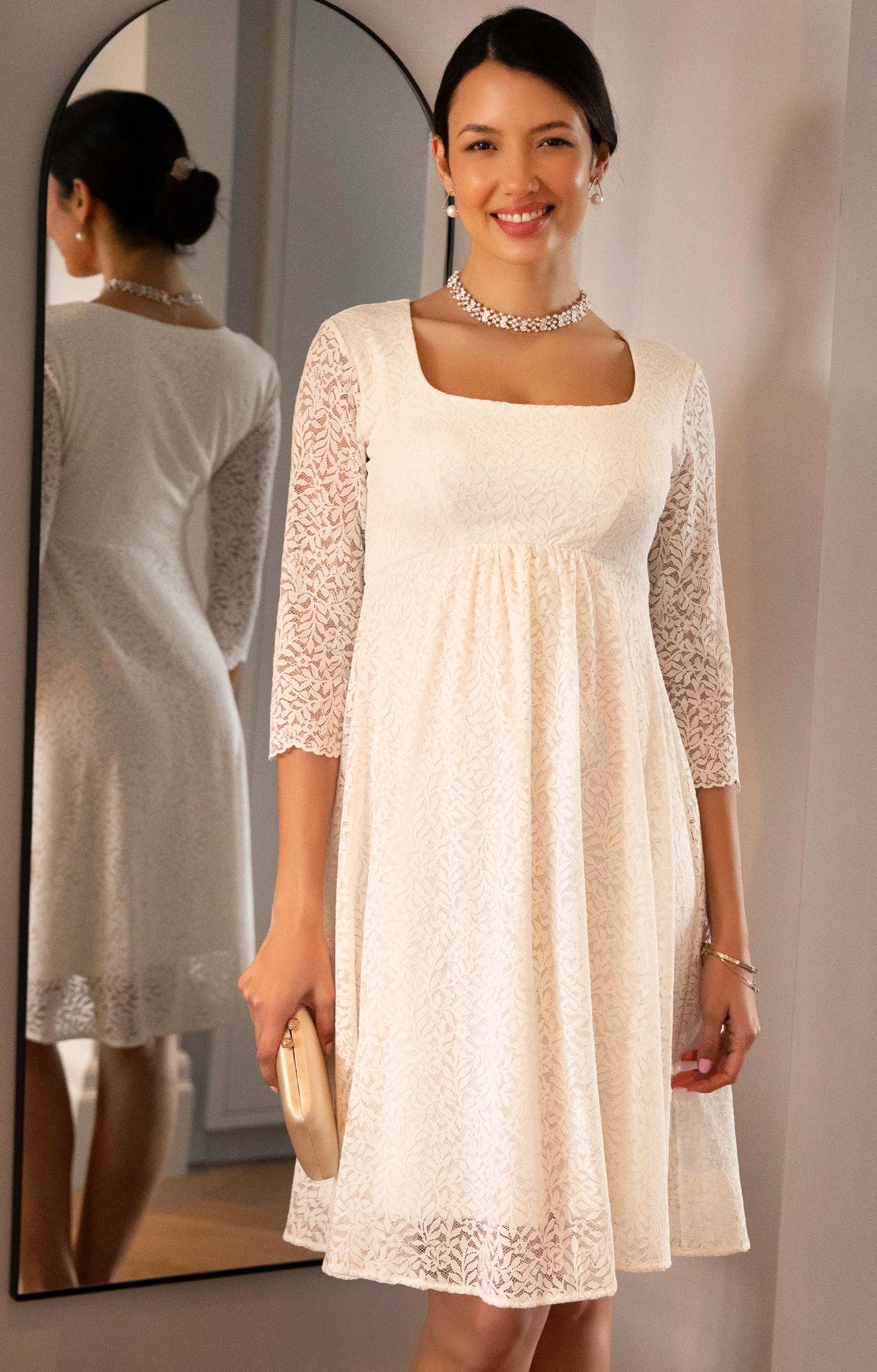 Dieses schmeichelhafte Umstandskleid ist aus hochwertiger, dehnbarer Blumenspitze gefertigt und vollständig mit weichem Jersey gefüttert. Es besitzt einen eleganten, quadratischen Ausschnitt und dreiviertellange Ärmel. Die Empire-Taille sitzt bequem über ihrem Bauch, während der sanft ausgestellte Rock eine fließende, romantische Silhouette bietet, die sich mit mitbewegt.
