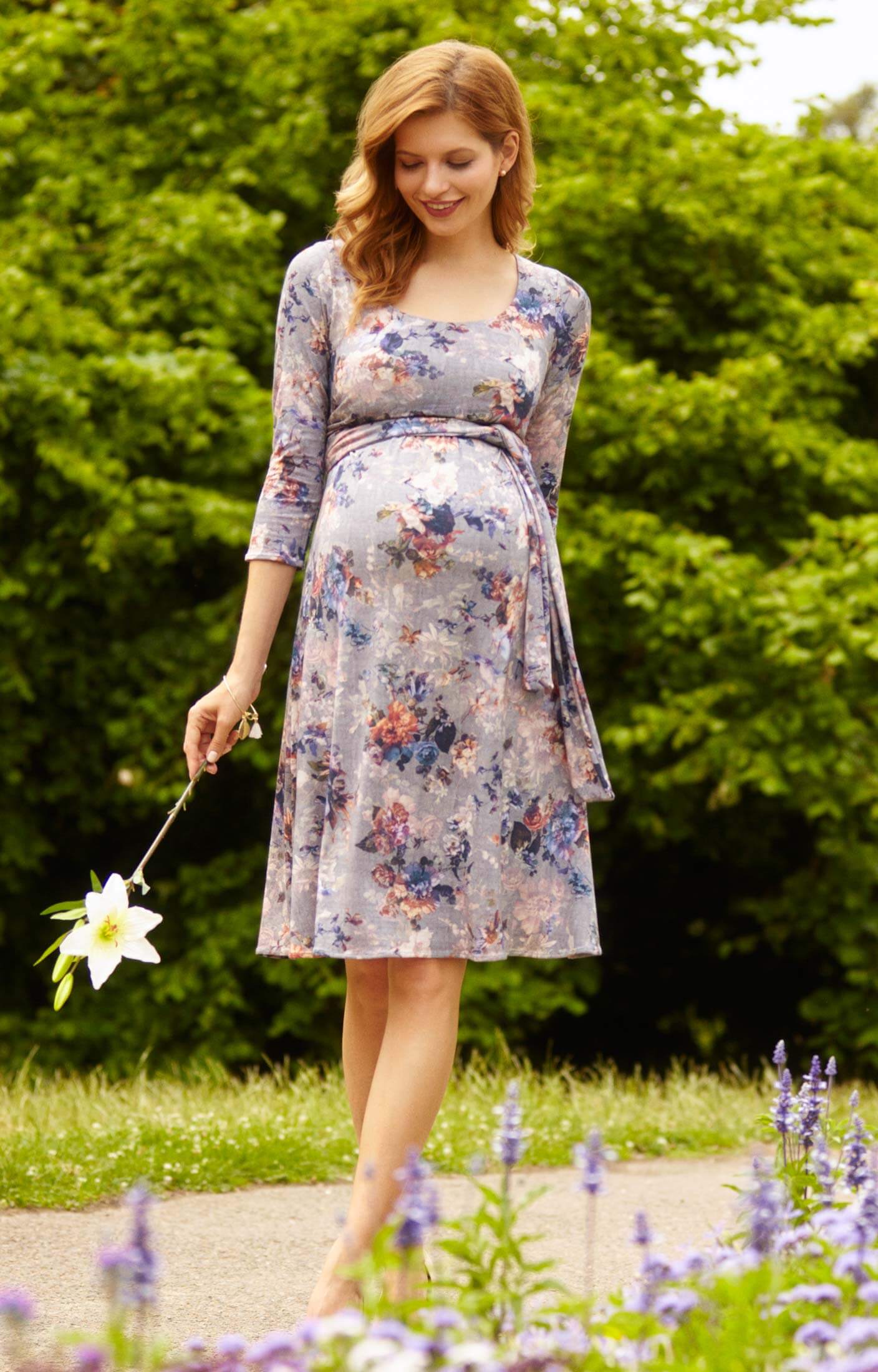 This flattering dress comes complete with ¾ sleeves and a swishy knee length skirt in signature Tiffany Rose super soft baby friendly jersey.