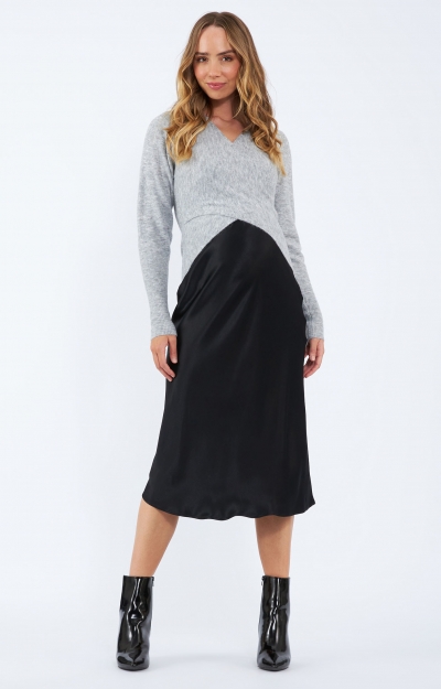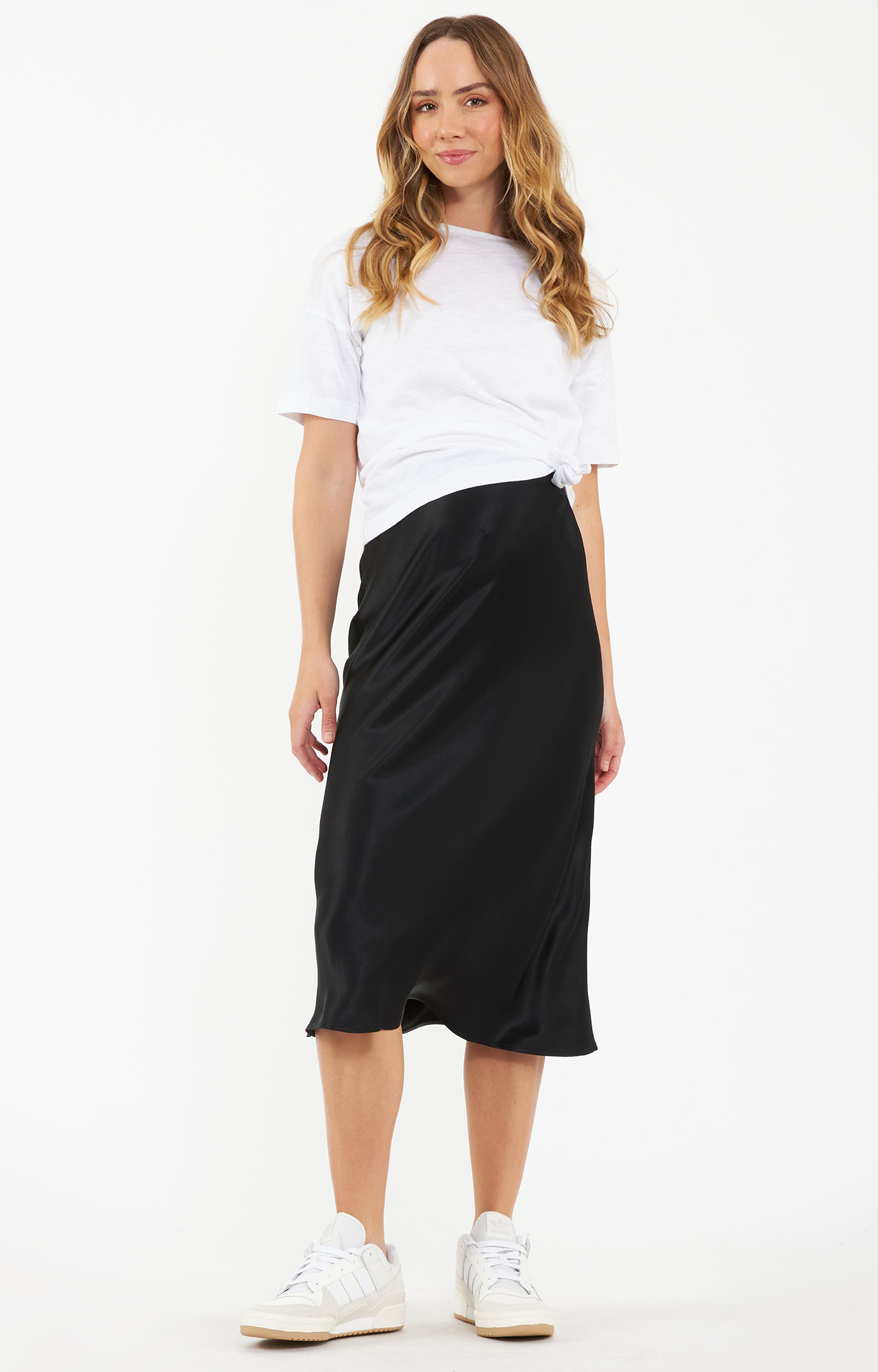 Made from a luxurious woven viscose satin, the Crystal Satin Maternity Skirt with its bias cut and semi-fitted silhouette ensure a graceful flow with every step. The fabric and the elastic band waist make this pull on skirt extremely comfortable to wear, and the shape is extremely flattering as it skims the hips and gently flares out to a flowing hem. It has movement whilst still giving shape, and doesn't cling. A piece that is easy to dress up or down for the office or the weekend, and can be transformed by the accessories you pair it with.