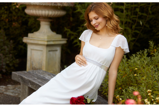 Beautiful new maternity bridal dresses with exquisite pearl embellishment and asymmetric detailing to leave you feeling extra special on your special day.