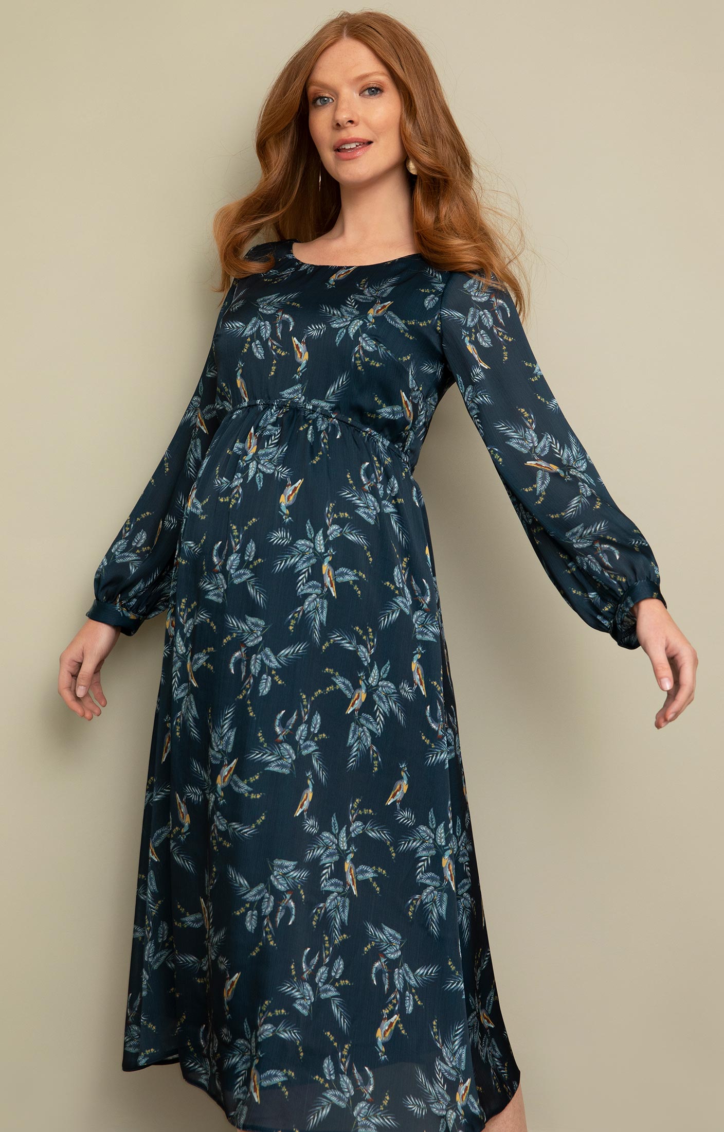 Une encolure légèrement échancrée, des manches longues transparentes, une taille empire stretch et une jupe légère font de la robe de maternité Aurora un délice à porter lors de n'importe quel événement. Elle est conçue pour être portée pendant et après la grossesse, et est idéale en voyage.