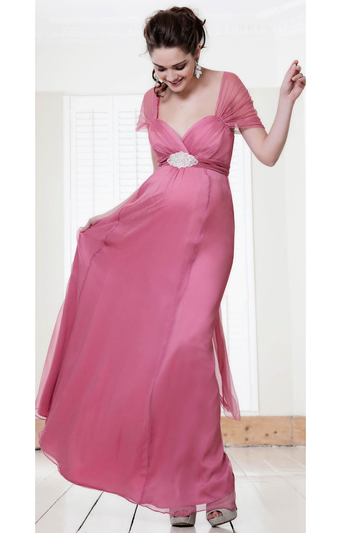 Designed in pure silk chiffon with an intricately gathered bodice and skirt that flows to the floor. Our Silk Sophia maternity dress is perfect for spring weddings and summer balls as it’s cool, light and easy to wear on your changing body shape.