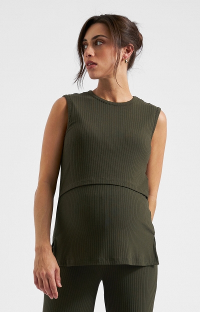Consider this khaki tank top with discreet nursing access as your sign to update your basics. It's rib-knitted from a premium jersey that's soft to the touch and shaped for a streamlined semi-relaxed fit, with and without bump. It's also our top pick to pack in your hospital bag. Complete the set with the Cindy Rib Pant.