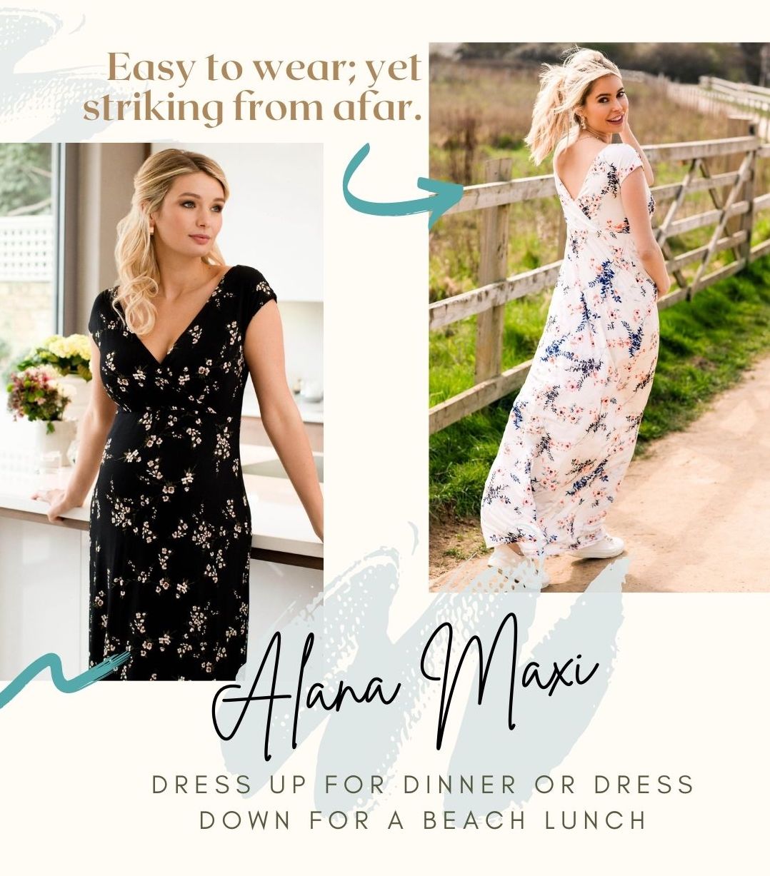 Alana, a floor length maternity maxi dress which is so easy to wear; yet striking from afar. Intelligently designed to drape over your new-found curves from the cross over bust right down to the ankle. Elegant and understated with heels for a date night, or pure comfort for your babymoon, with a metallic sandal and clutch, Alana promises easy sophistication. And just like the Alessandra, it's also perfect for breastfeeding in the 4th trimester.
