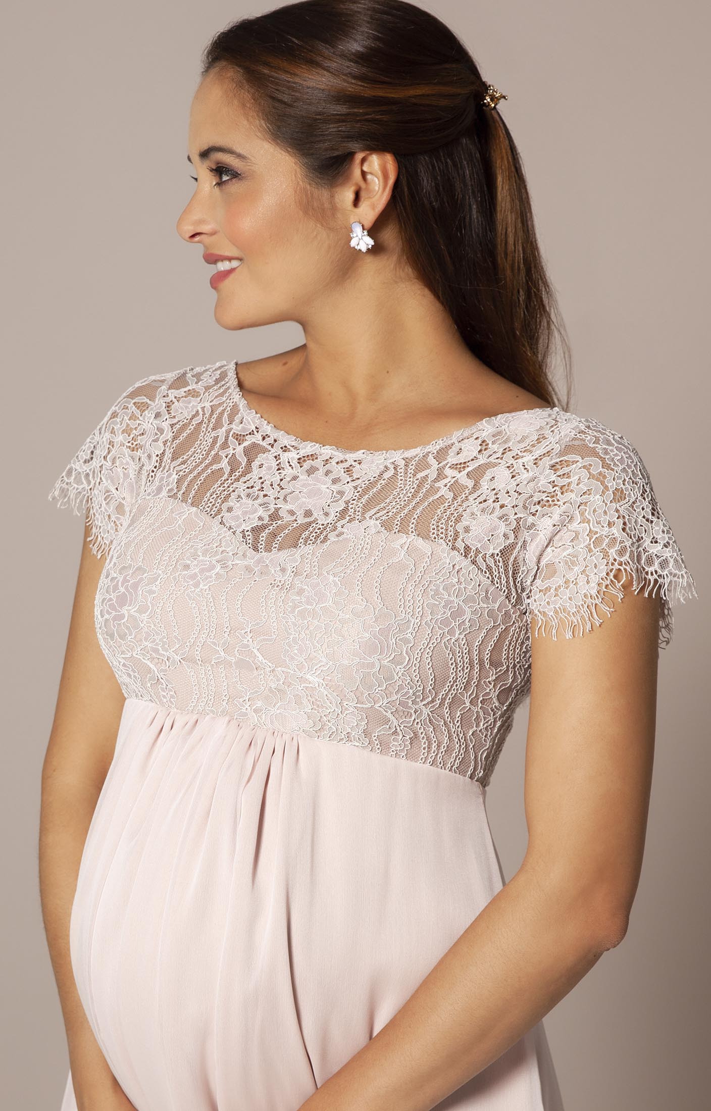 Our Elizabeth Maternity Dress in Soft Mist Pink combines a pretty Leavers lace and floaty chiffon skirt to create an effortless silhouette. With a subtle pink and grey hued bodice and complimentary pink skirt, this dress is perfect for brides looking for an alternative to white and pregnant bridesmaids too.