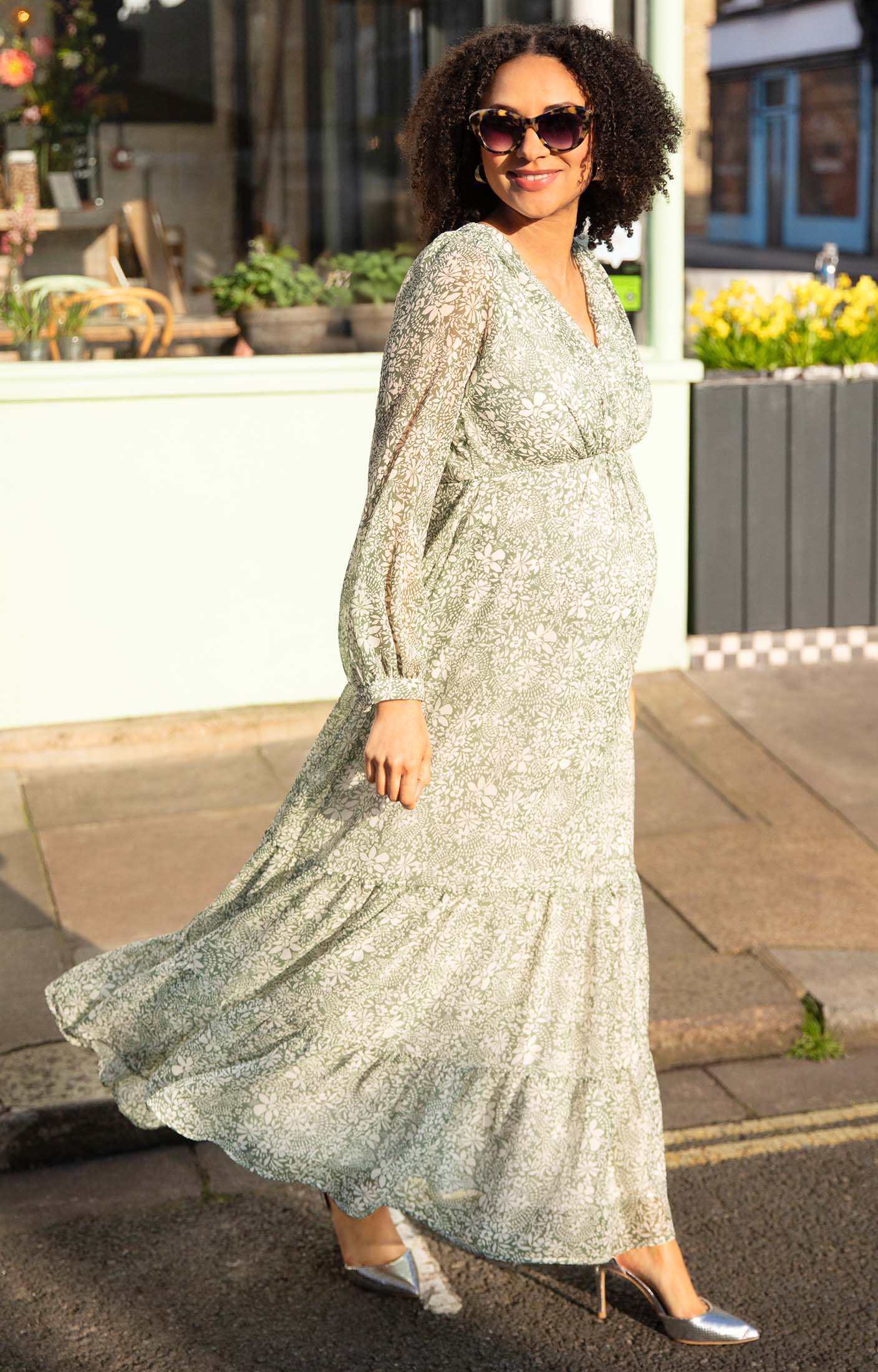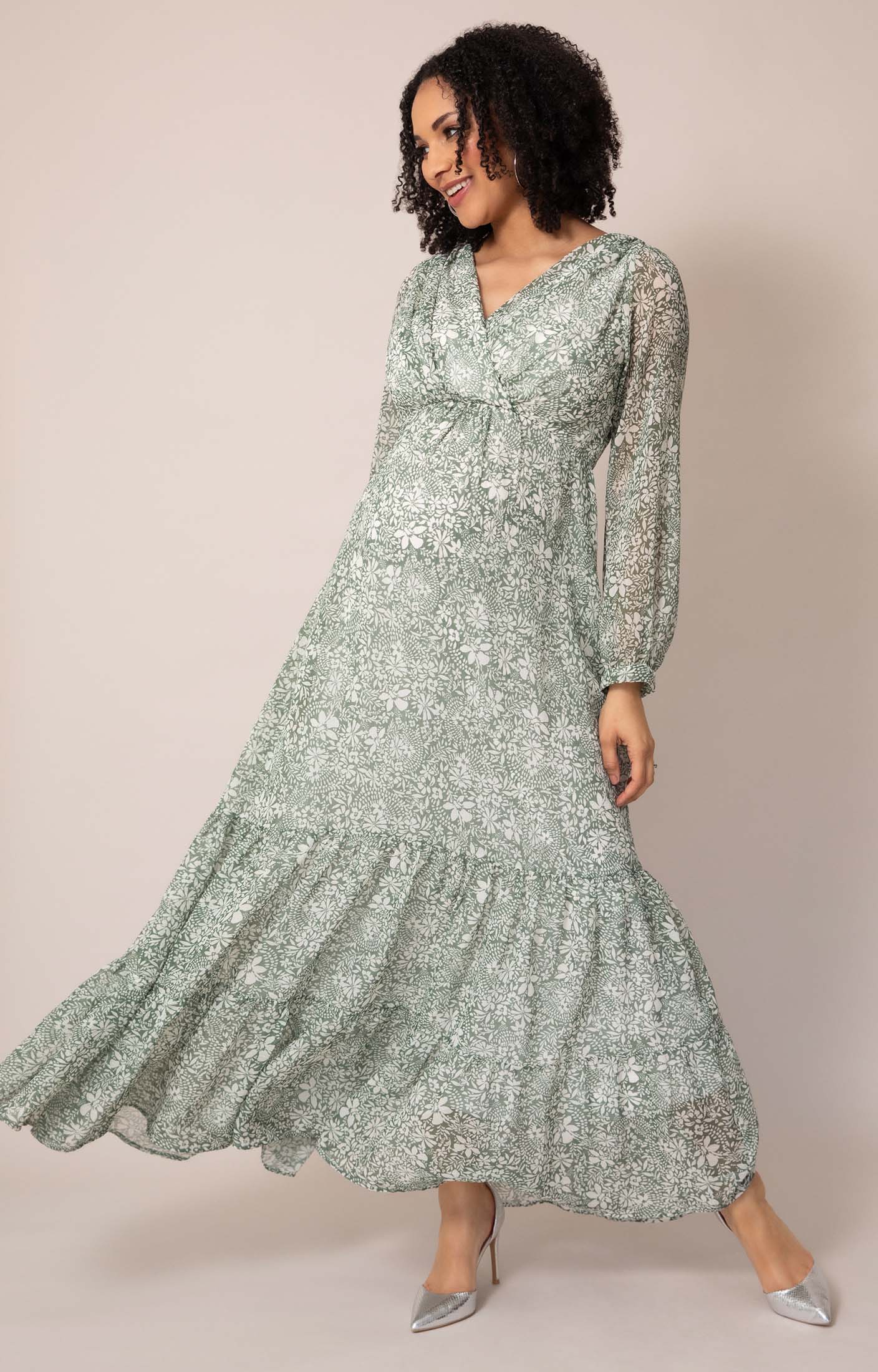 - Botanical green floral maternity maxi dress in lightweight chiffon