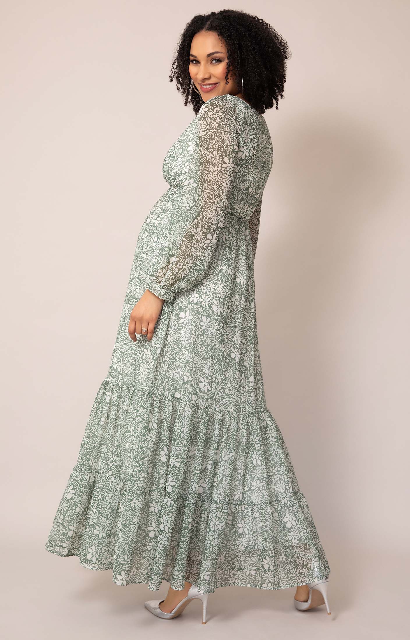 Feel beautiful in this botanical green maxi dress, thoughtfully designed to flatter blossoming curves.