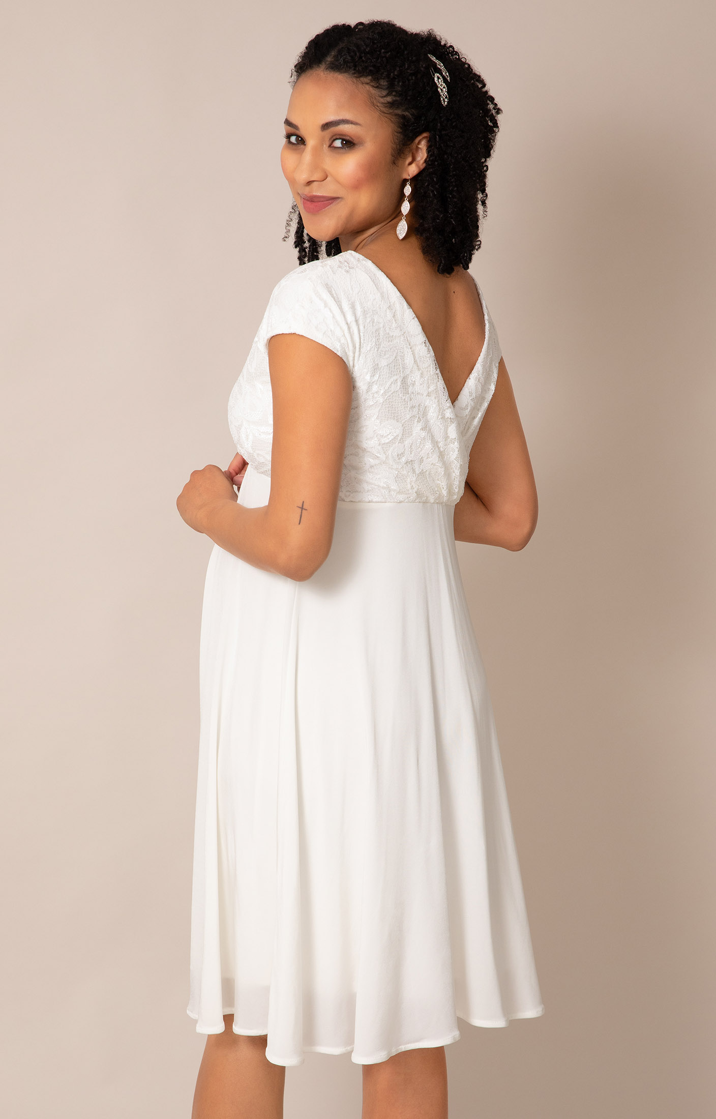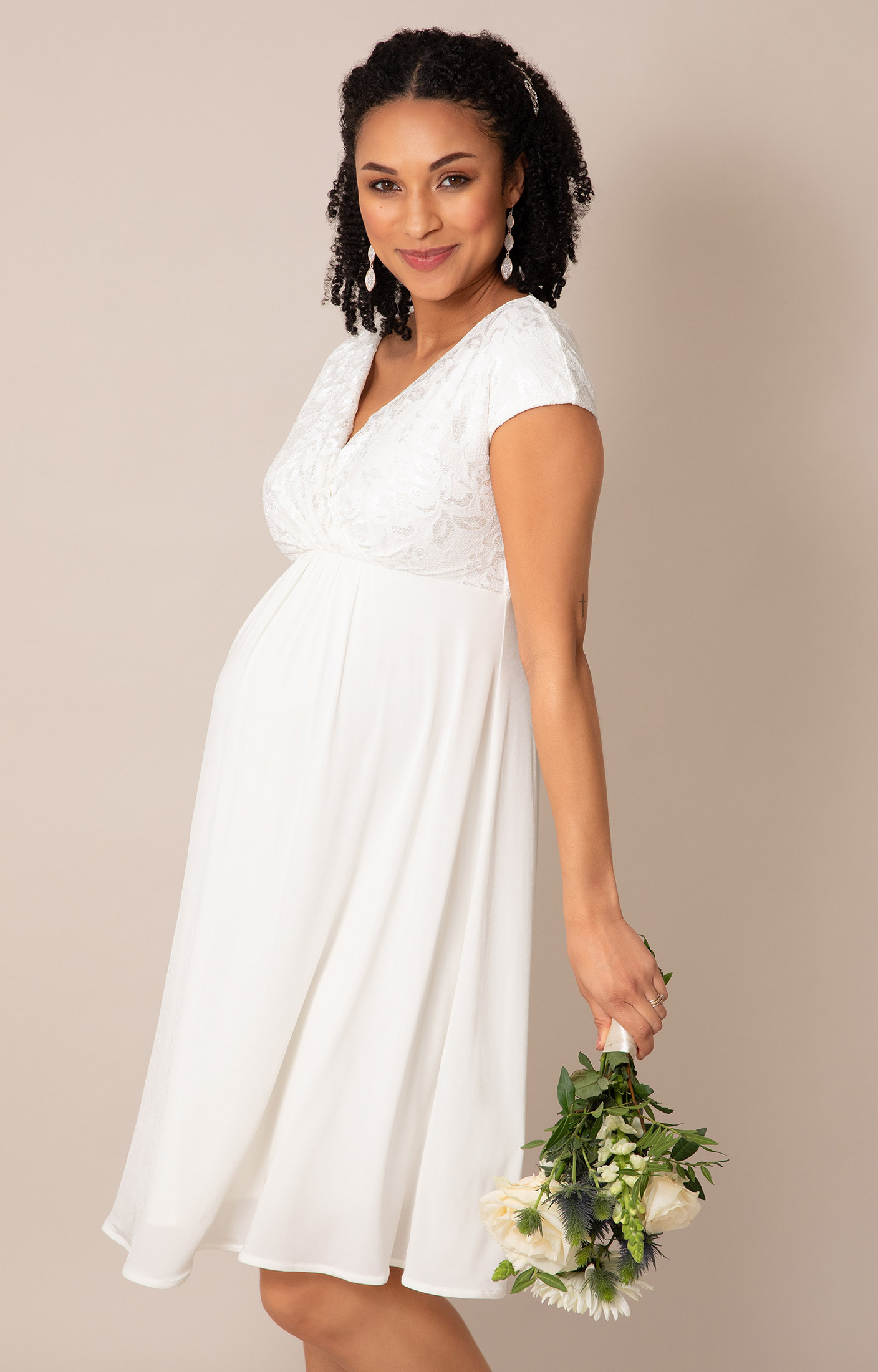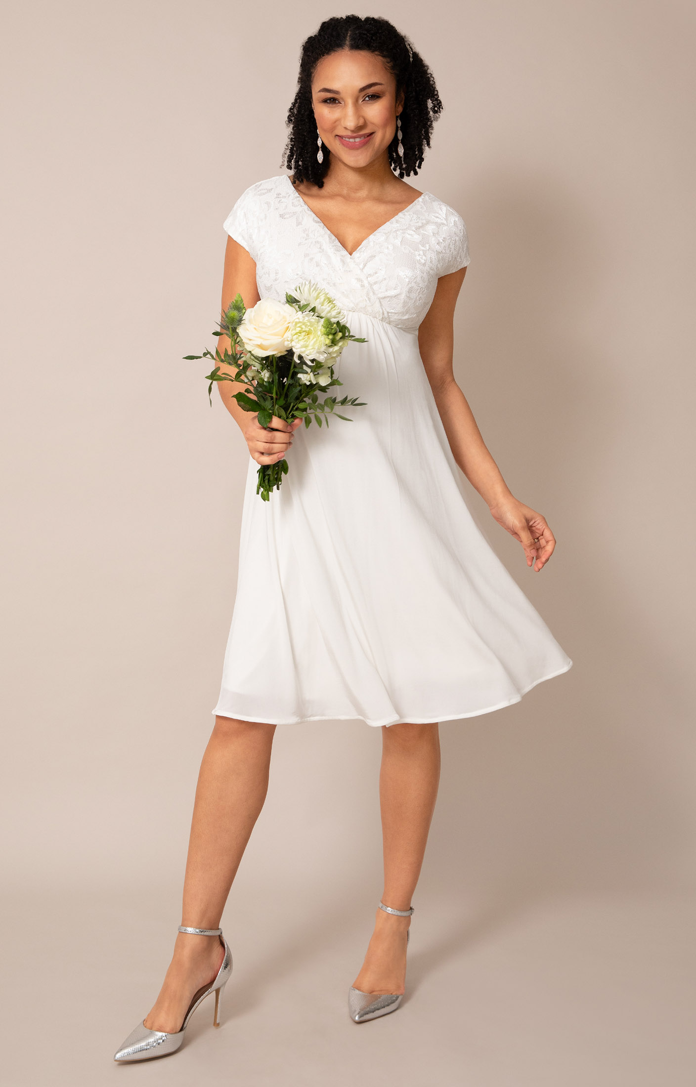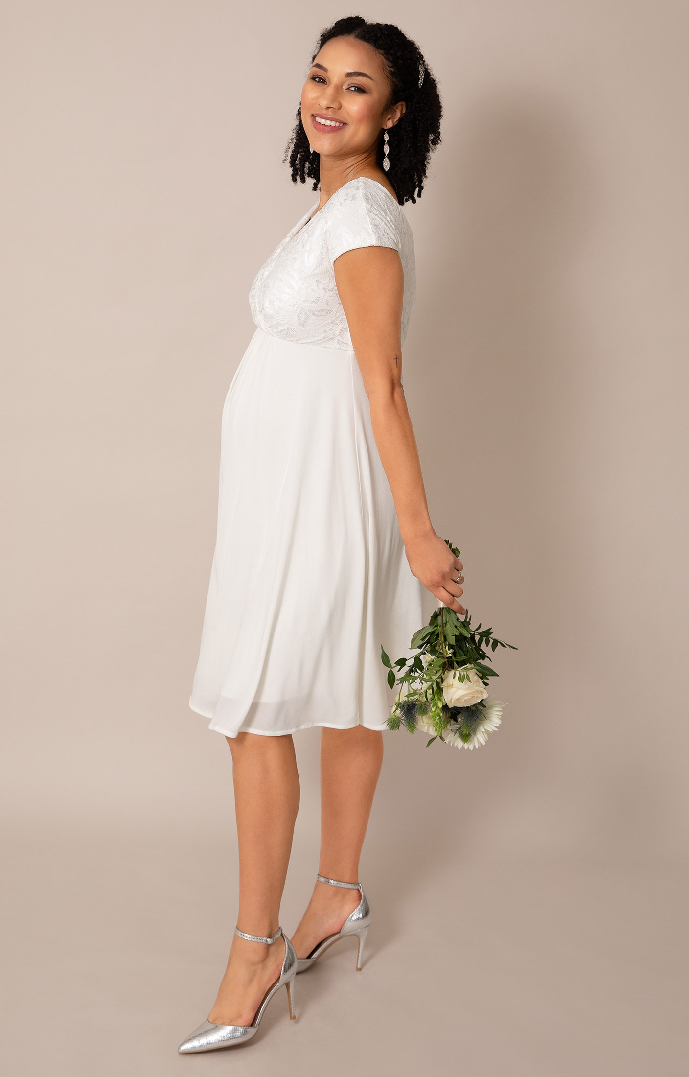 Crafted from stretchy floral lace and a softly draping sheen jersey skirt, this flattering design features a cross-over neckline and cap sleeves for gentle coverage. The empire waist sits comfortably above your bump, while the fluid knee-length skirt creates easy movement.