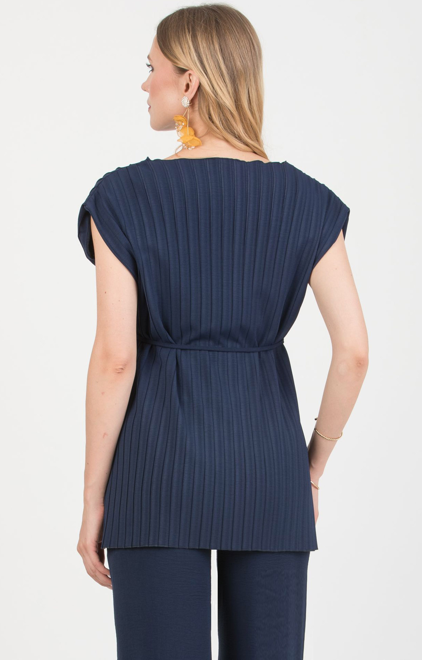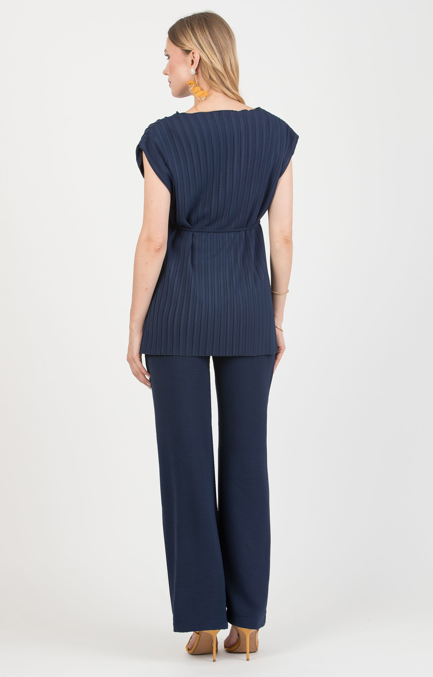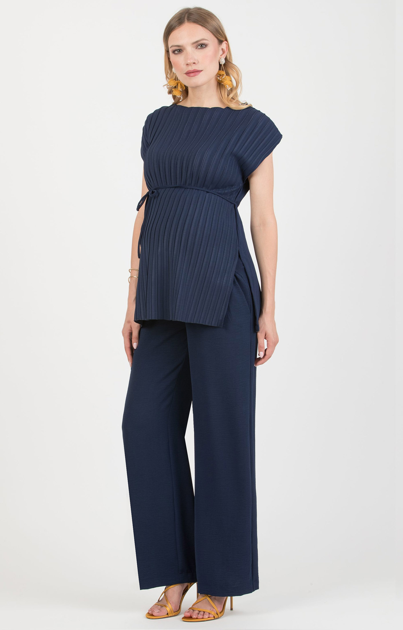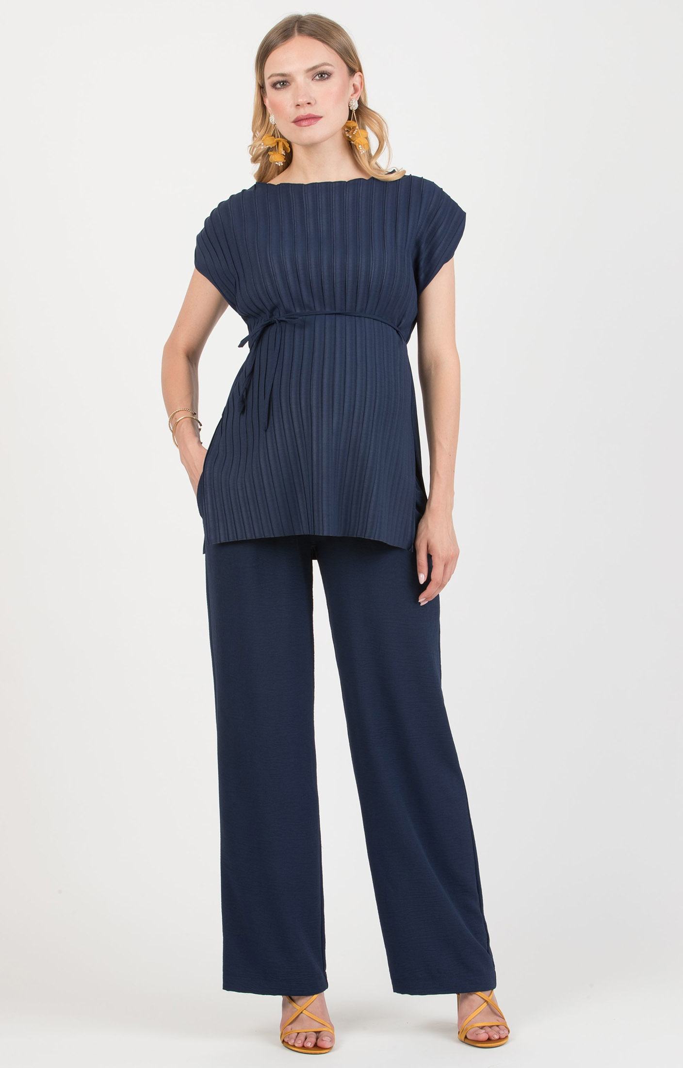 Light and refined, this pleated crepe top features a boat neckline, kimono sleeves, and side slits at the hem. The separate belt defines the waist and adds a delicate bow, creating a polished look. Pairs perfectly with the INES trousers for an elegant and coordinated outfit during pregnancy.