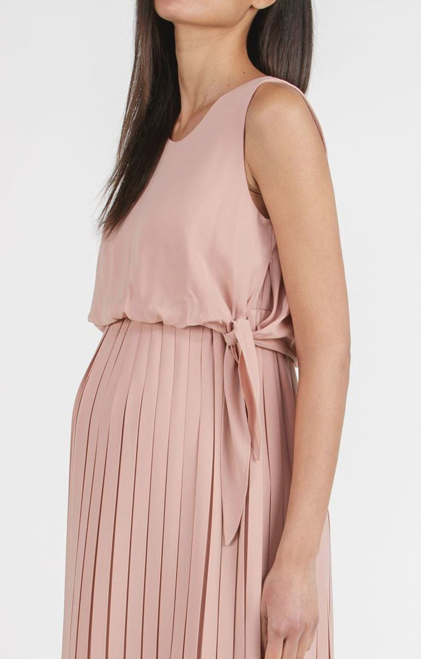 Sleeveless maternity and nursing dress, perfect for elegant occasions or ceremonies. The concealed zips make breastfeeding easy while ensuring discretion and practicality. The pleated skirt, side ribbon and delicate back buttons add a refined touch, while the soft fabric lends an effortlessly elegant feel.