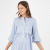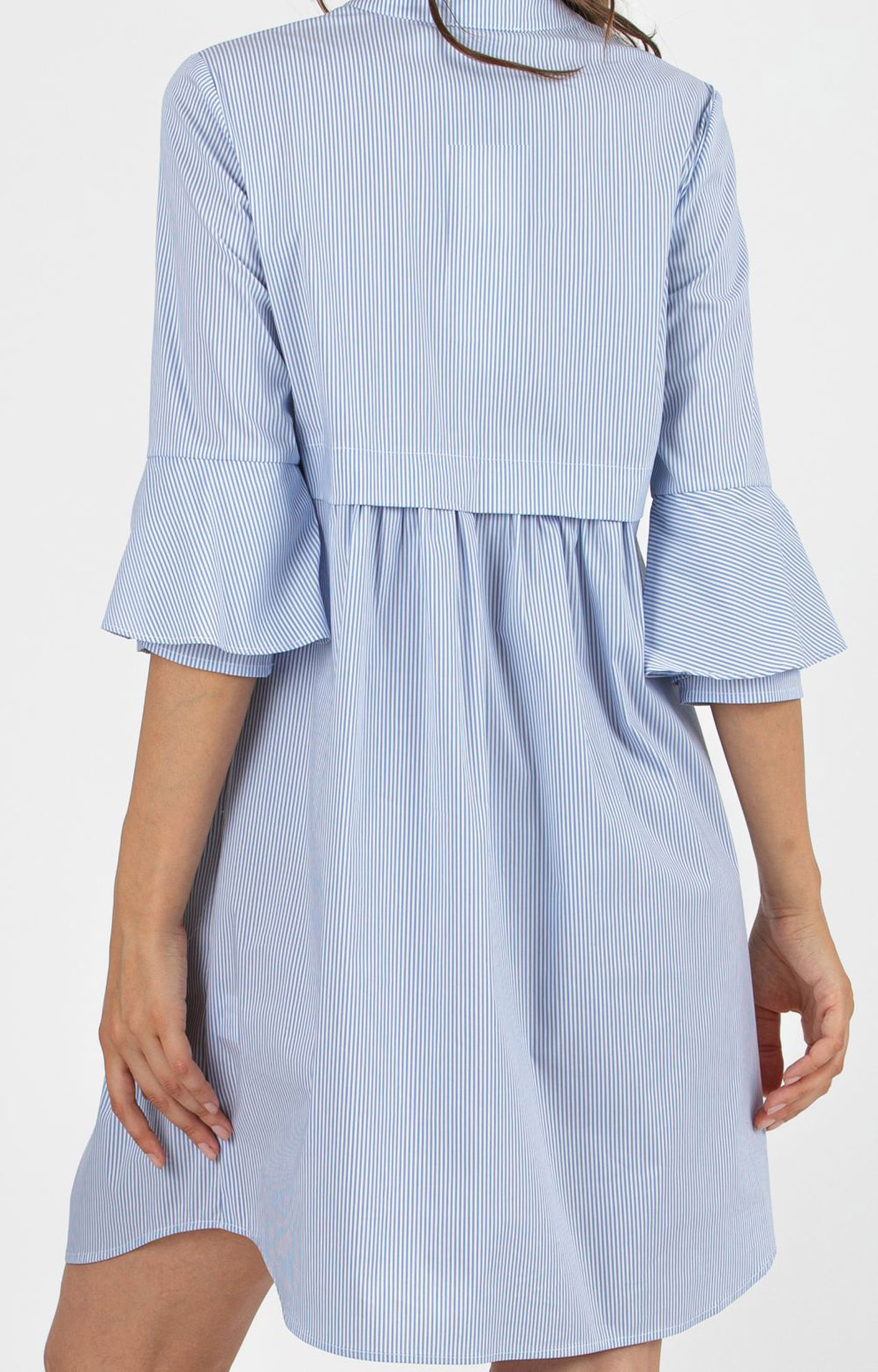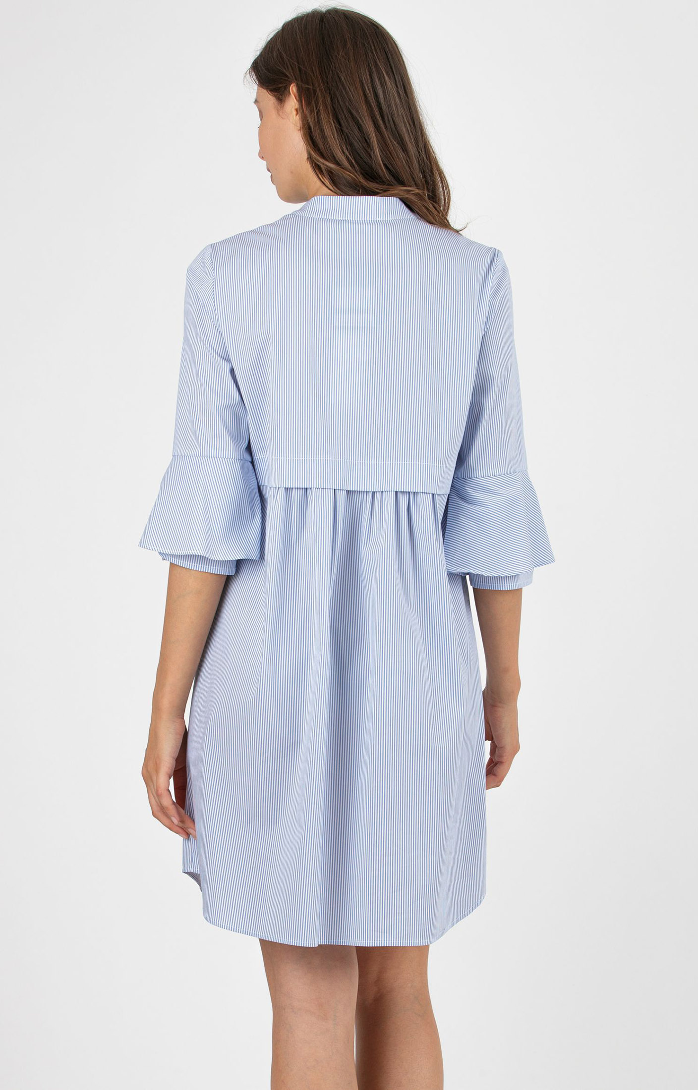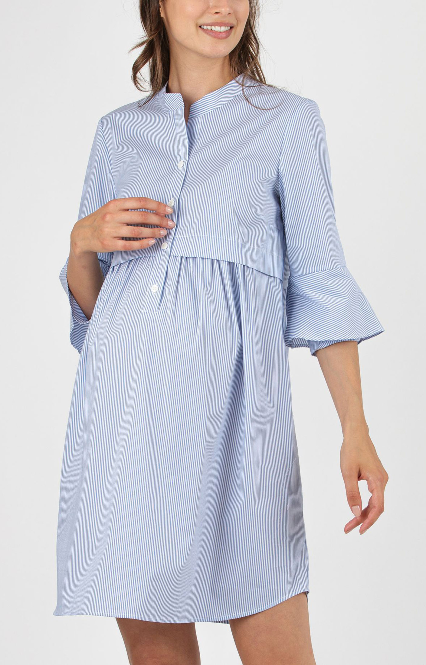 Lightweight and versatile striped maternity and nursing dress in cotton poplin with a mandarin collar. The 3/4 double-layer bell sleeves add a modern touch, while the under-bust bodice gently highlights the waistline. The front buttons make breastfeeding easy and practical. Perfect for relaxed, everyday occasions.