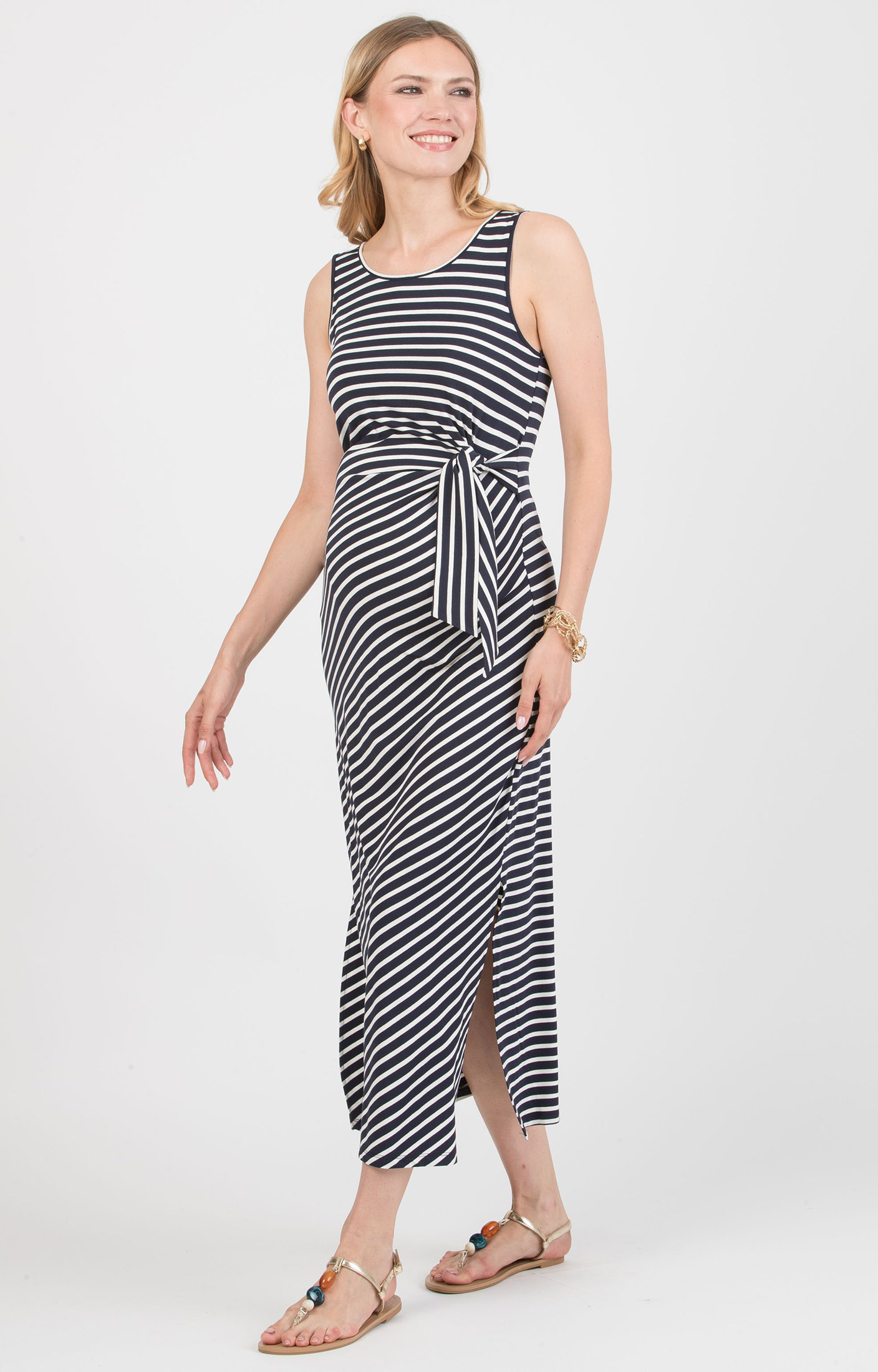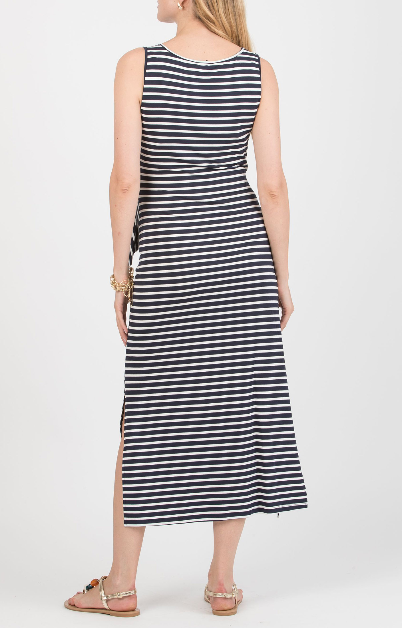 Easy and practical, this striped viscose jersey dress is ideal from spring through summer. The round neckline, wide shoulder straps and side knot create a casual look with a beautifully feminine silhouette. Wear it with a light sweater or a denim jacket — and don’t forget to pack it for your beach holidays.