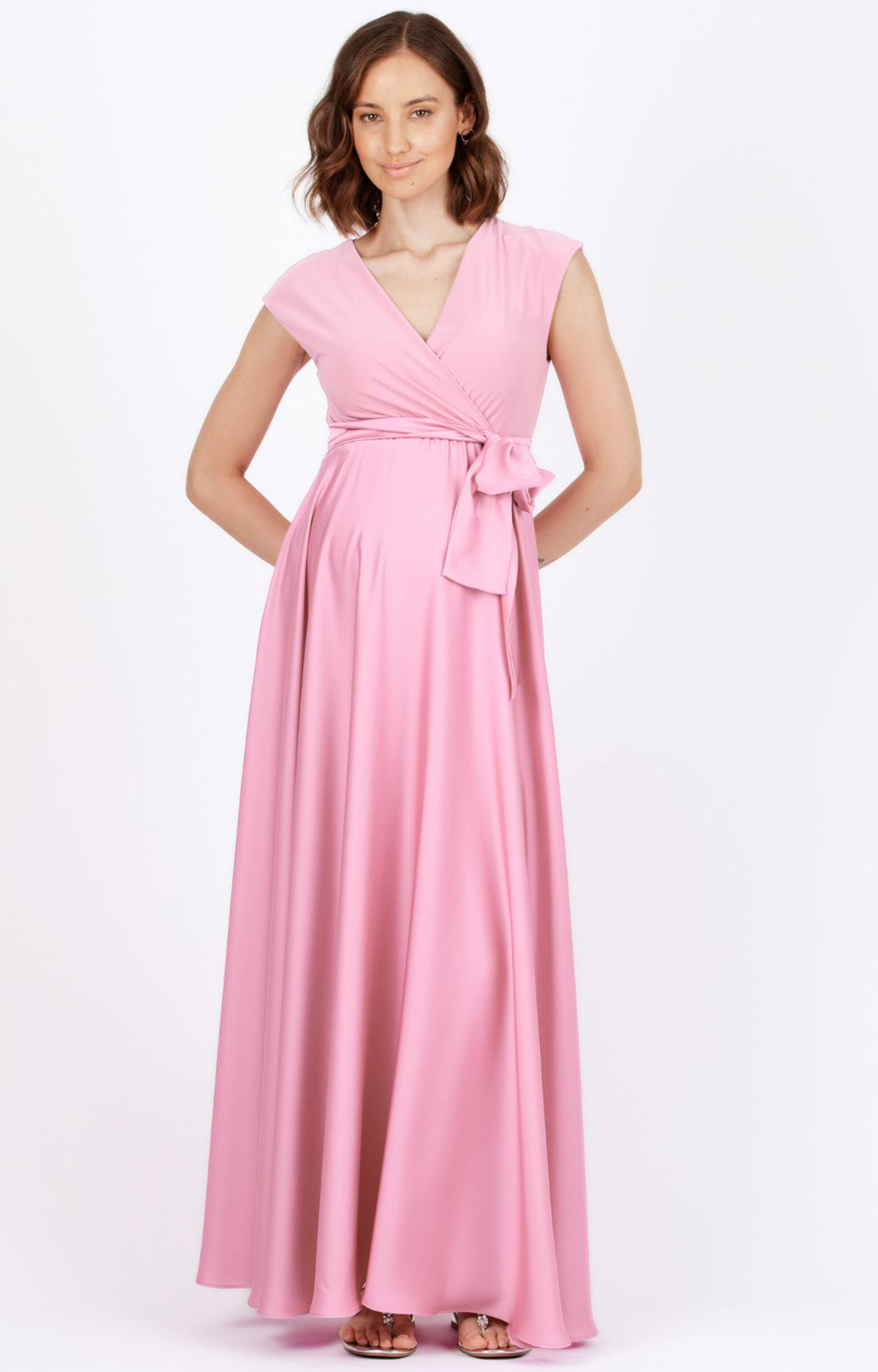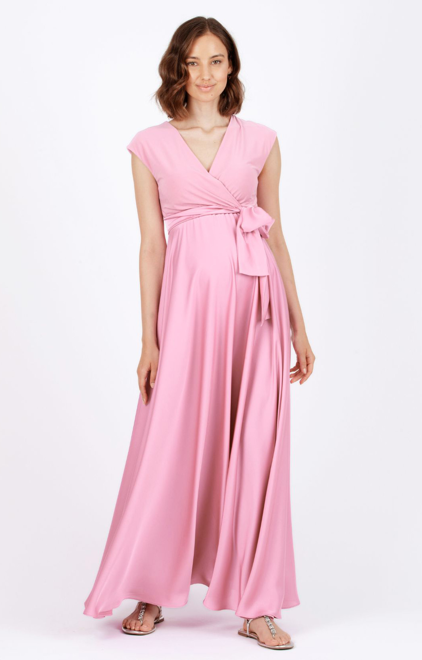 Maternity and nursing maxi dress with crossover neckline and cap sleeves. The bodice in jersey opens up to provide comfortable and practical access for nursing after baby is born. The wide full skirt in satin fabric gives plenty of space for growing bump, while the empire waist with coordinated belt highlights the silhouette. Perfect for a ceremony or an elegant occasion, it is suitable for all the stages of pregnancy, the post-partum period and beyond.
