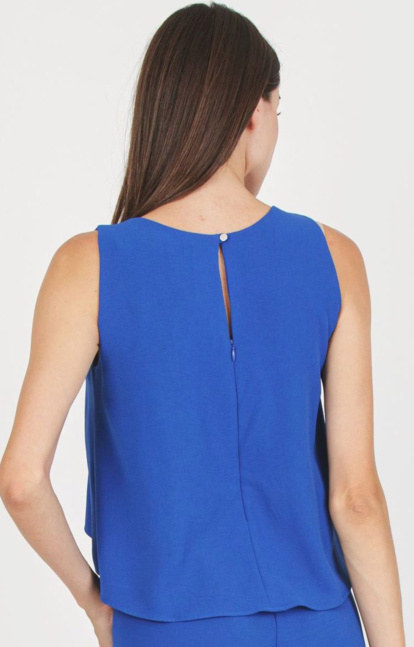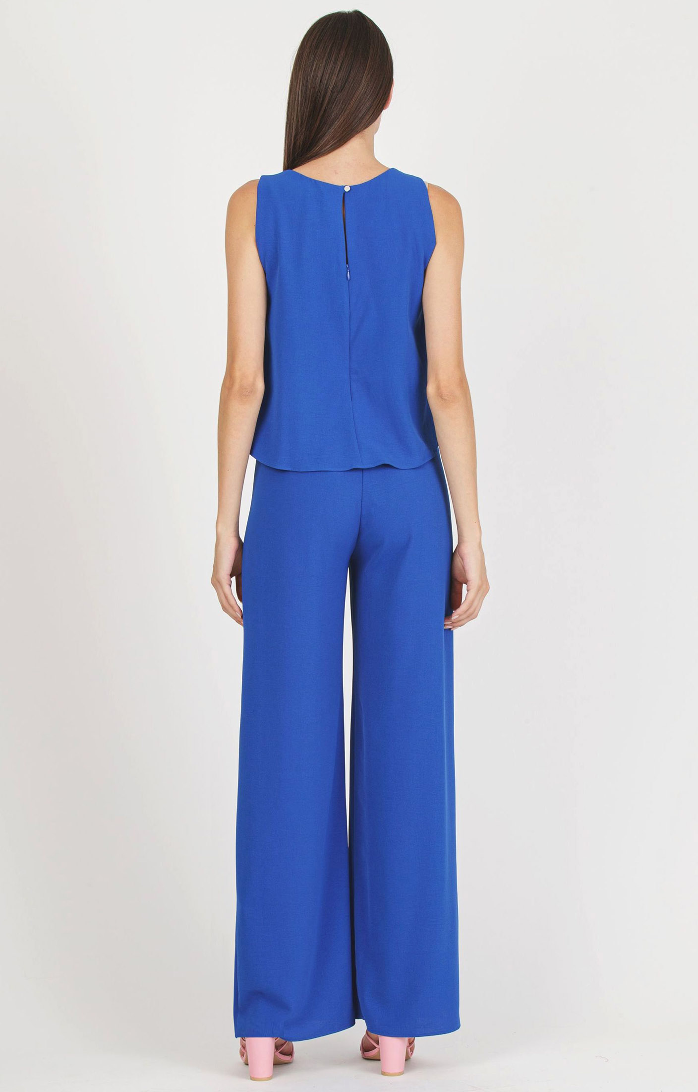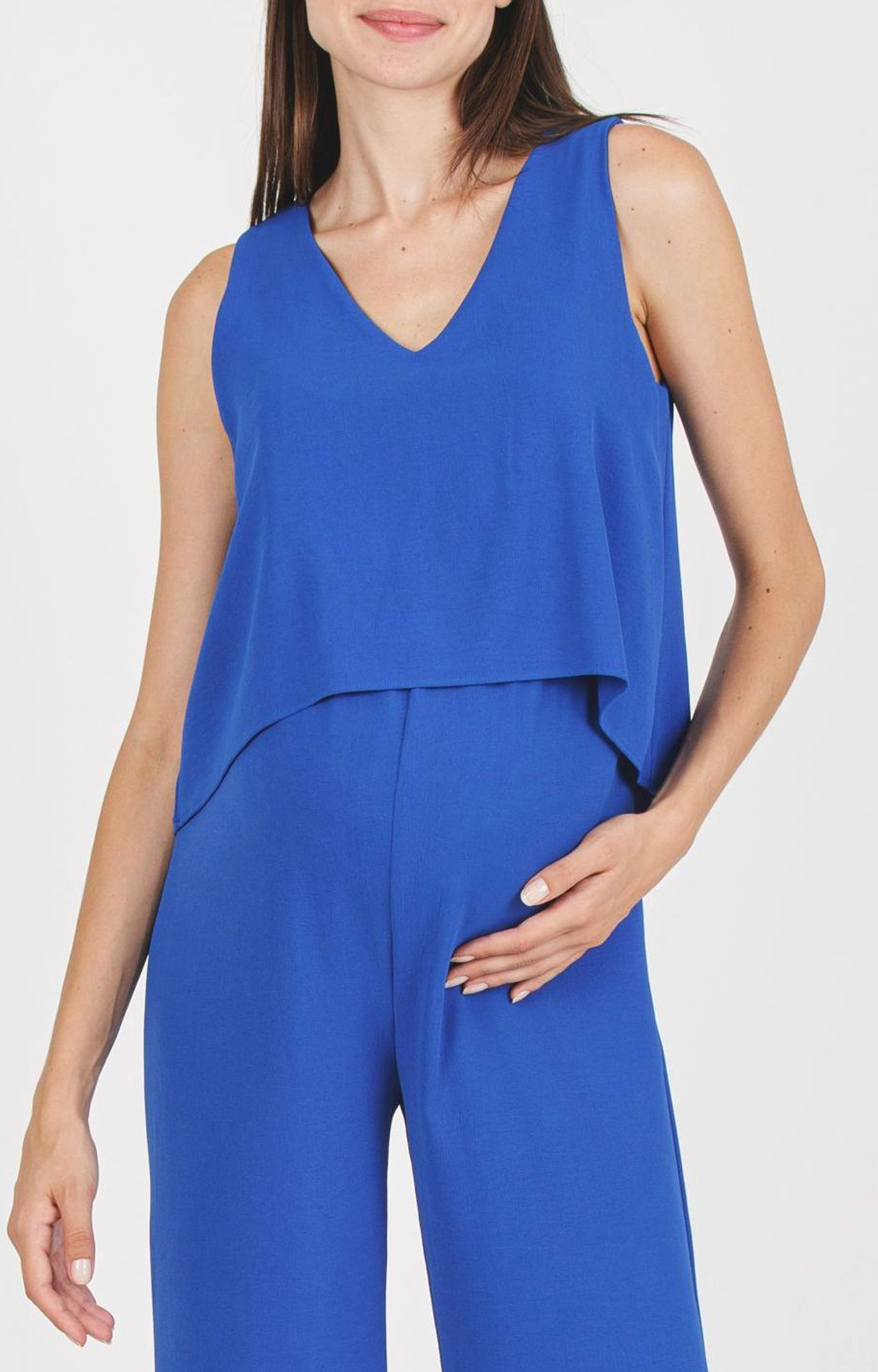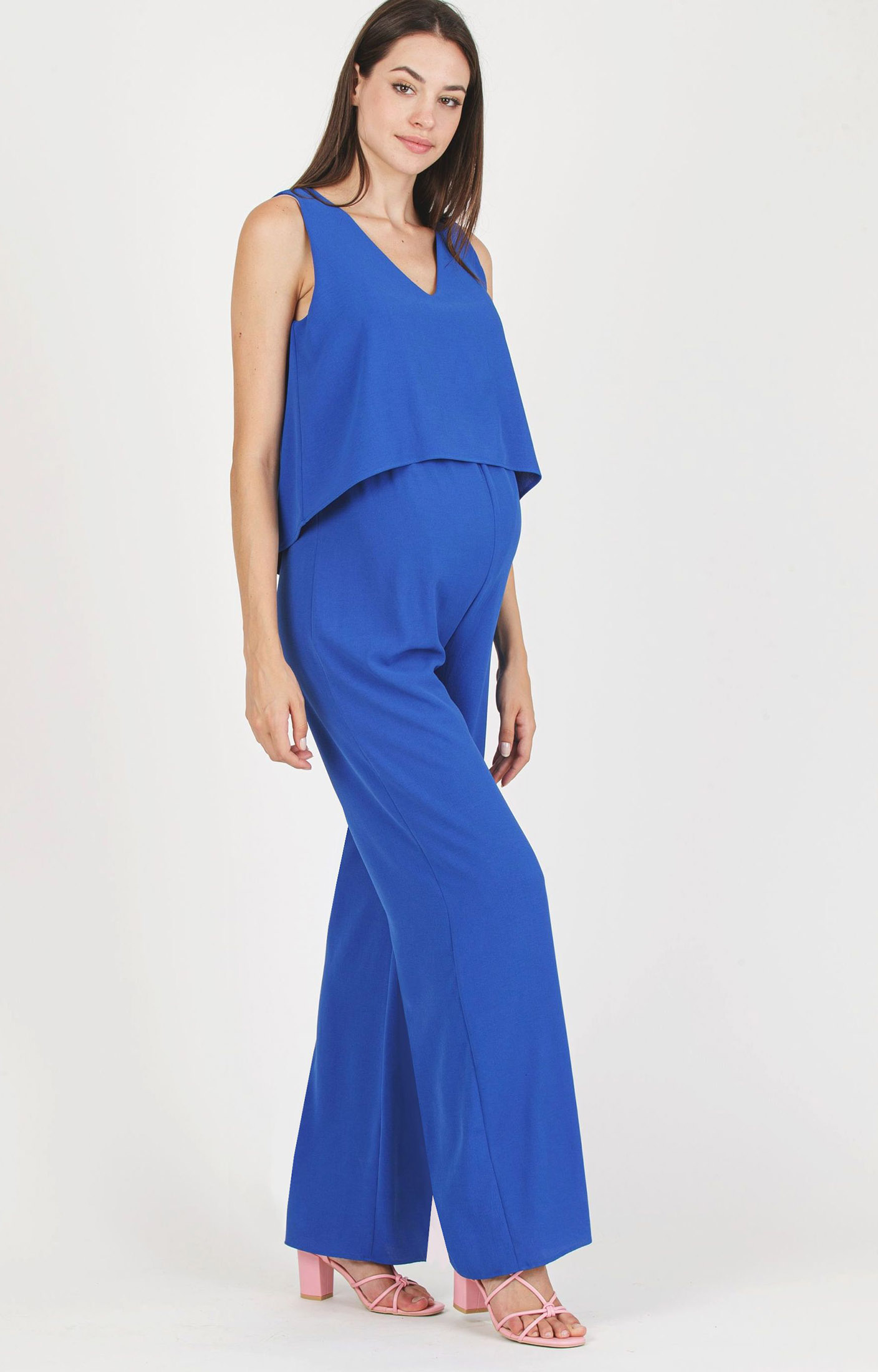 Versatile and modern maternity jumpsuit, it is sleeveless and it has with V-neck. The A-line bodice hides perfectly two zips permit to easily breastfeed. The elastic empire waist highlights the silhouette, while lightweight crepe cady fabric offers a perfect fit from the beginning to the end of pregnancy. Featuring a long vertical zip at the back and a small back keyhole with a button-loop closure. Suitable for a casual chic look.