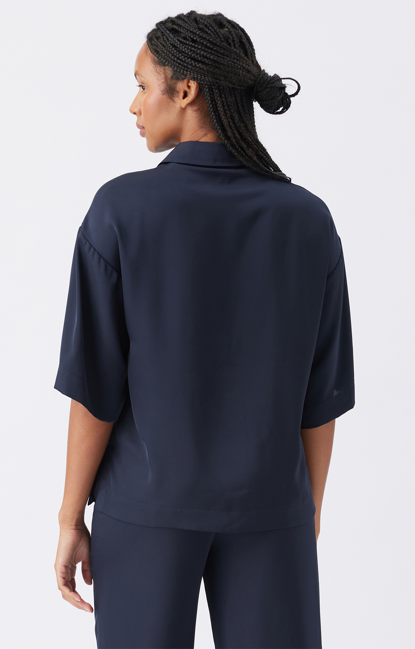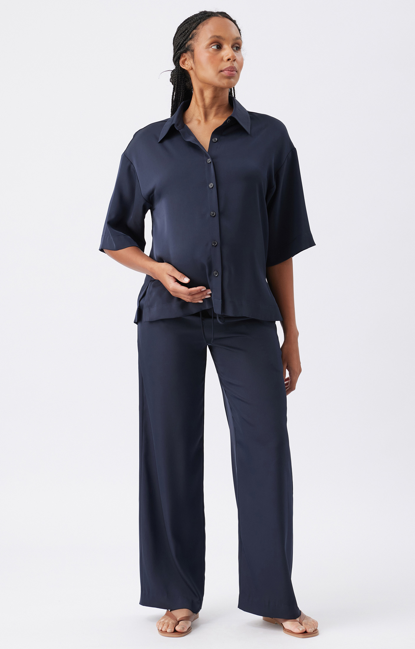 Meet the Tamara Satin Shirt — a transseasonal wardrobe essential that effortlessly blends comfort and style. Made from soft matte satin polyester, this relaxed-fit shirt features a classic collar, short sleeves, and a button-up front with side-seam splits for easy nursing access. Lightweight with a polished finish, it’s perfect for dressing up or down all season long. Complete the look with our Tamara Satin Pull-On Pant.