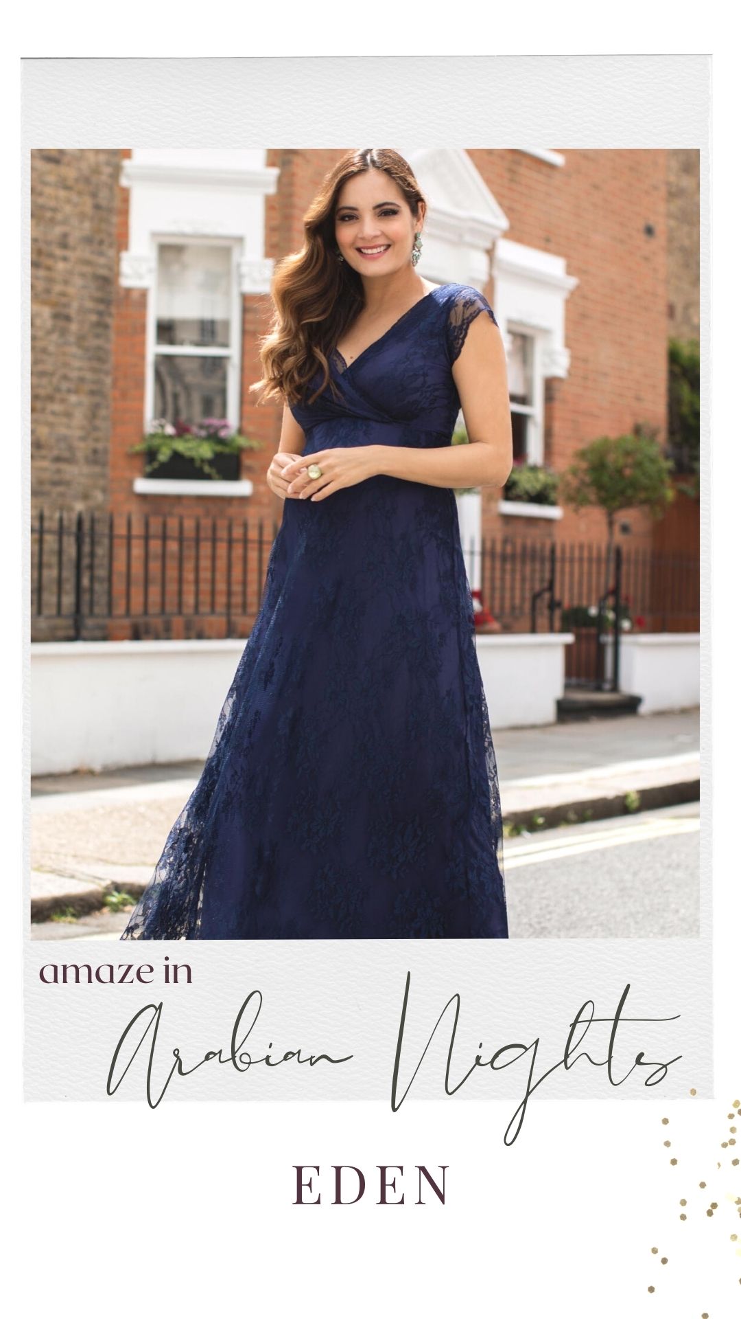 The rich blue of our intricate floral lace gives the Eden Gown an instant wow factor. The gown has been designed with just enough stretch to cocoon her bump in comfort with no hint of a cling over bump or bust. Sumptuously sheer, the lace allows a demure peek of the soft tonal lining with its glowing sheen, which ensures the perfect swish as you move.