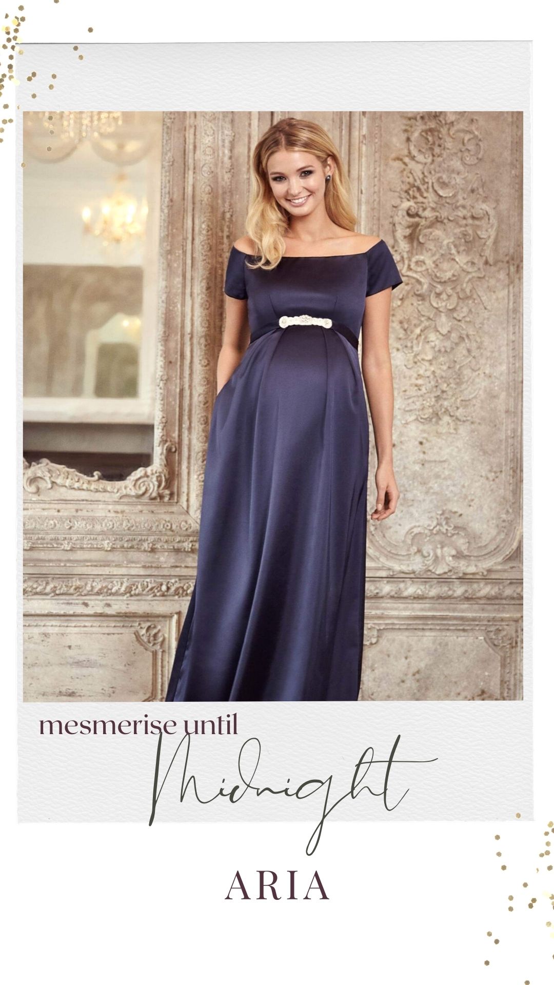 Our Aria gown in Midnight blue will have your bridesmaids feeling elegant and sophisticated. Designed using a rich navy satinesque fabric that drapes to the floor, the effect is dramatic and eternally stylish. The Aria has gentle darts at the bust and a concealed zip at the back - with a beautiful skirt that pleats over bump before cascading to the floor. The skirt has been designed with plenty of movement so there's no need to worry about a trip hazard. We suggest adding our sparkling Aurelia sash to finish.