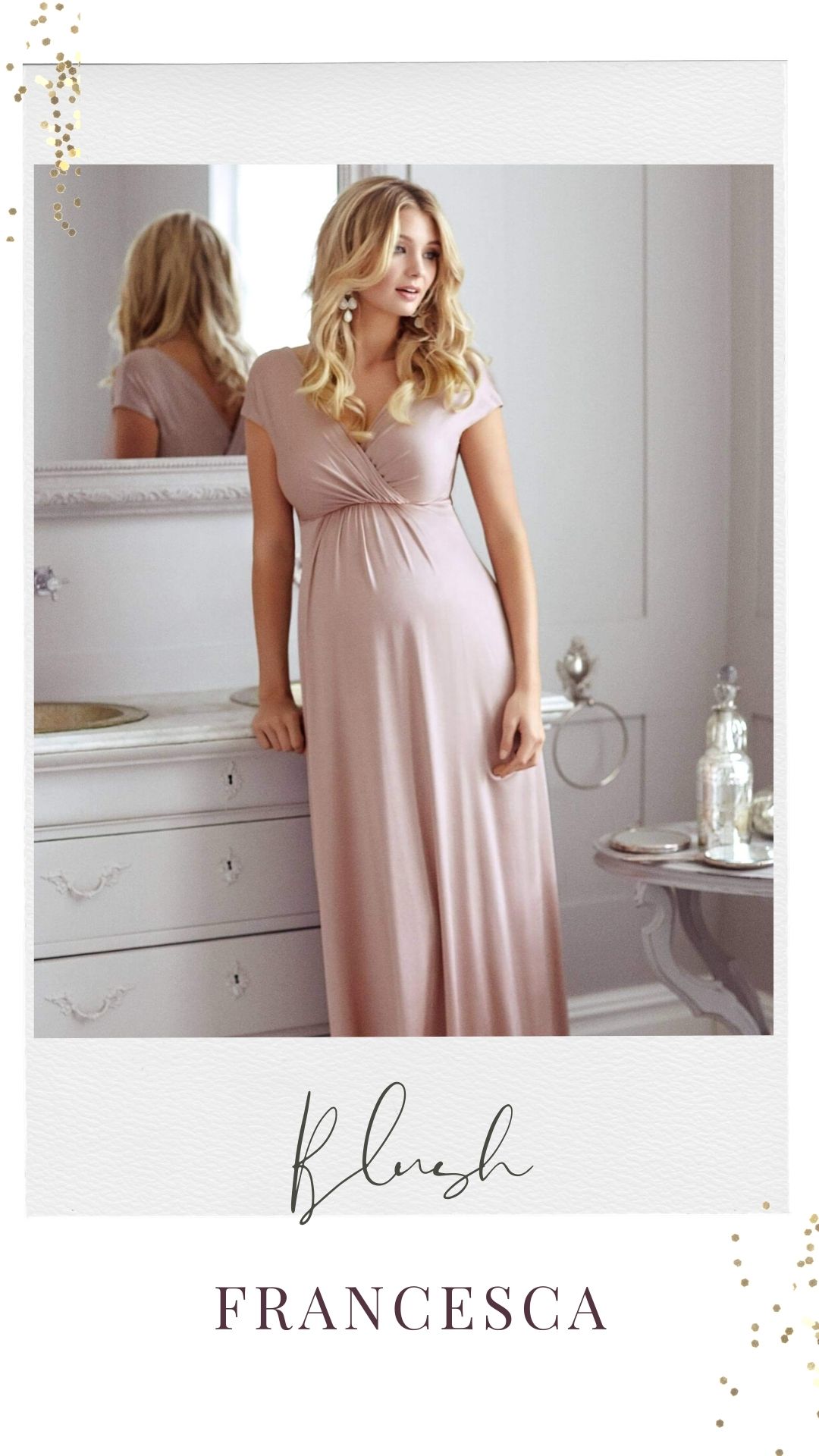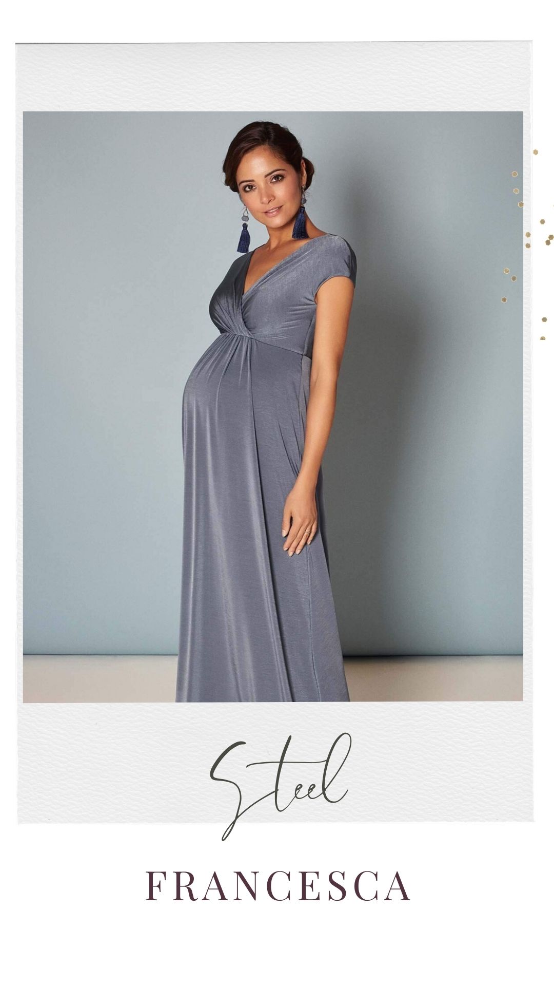 The Francesca gown is one of most popular bridesmaid styles and we offer this in a complementary triad of colours - Blush Pink, Champagne and Steel blue. These shades are designed to work beautifully together and offer the perfect solution if you're lucky enough to have more than one expecting bridesmaid. Full-length with a crossover neckline both front and back - this dress has a substantial drape yet a lightweight feel. The stunning soft, stretch fabric flatters growing curves with style and comfort, finishing with a skirt that glides with a gorgeous swish.