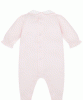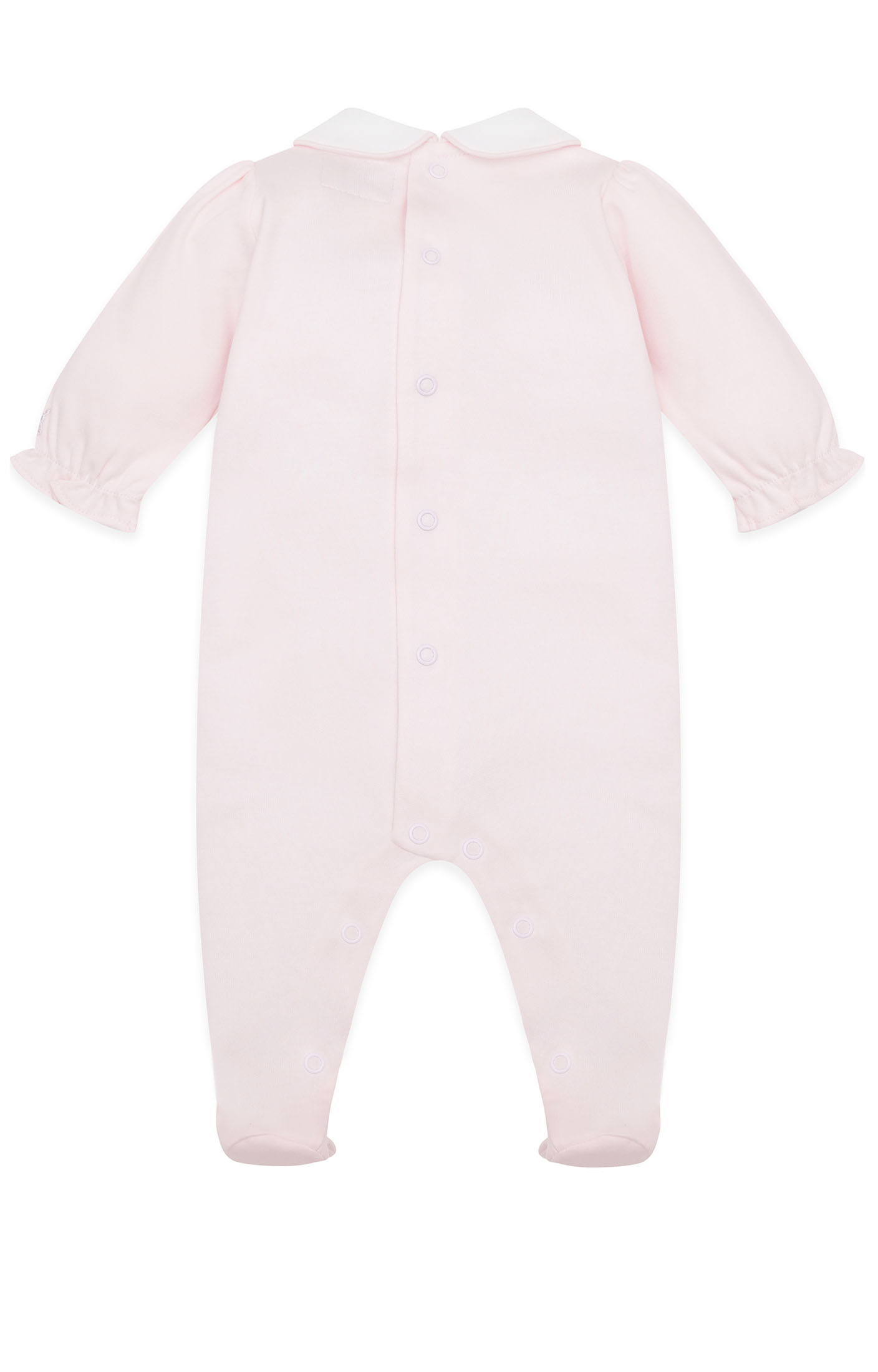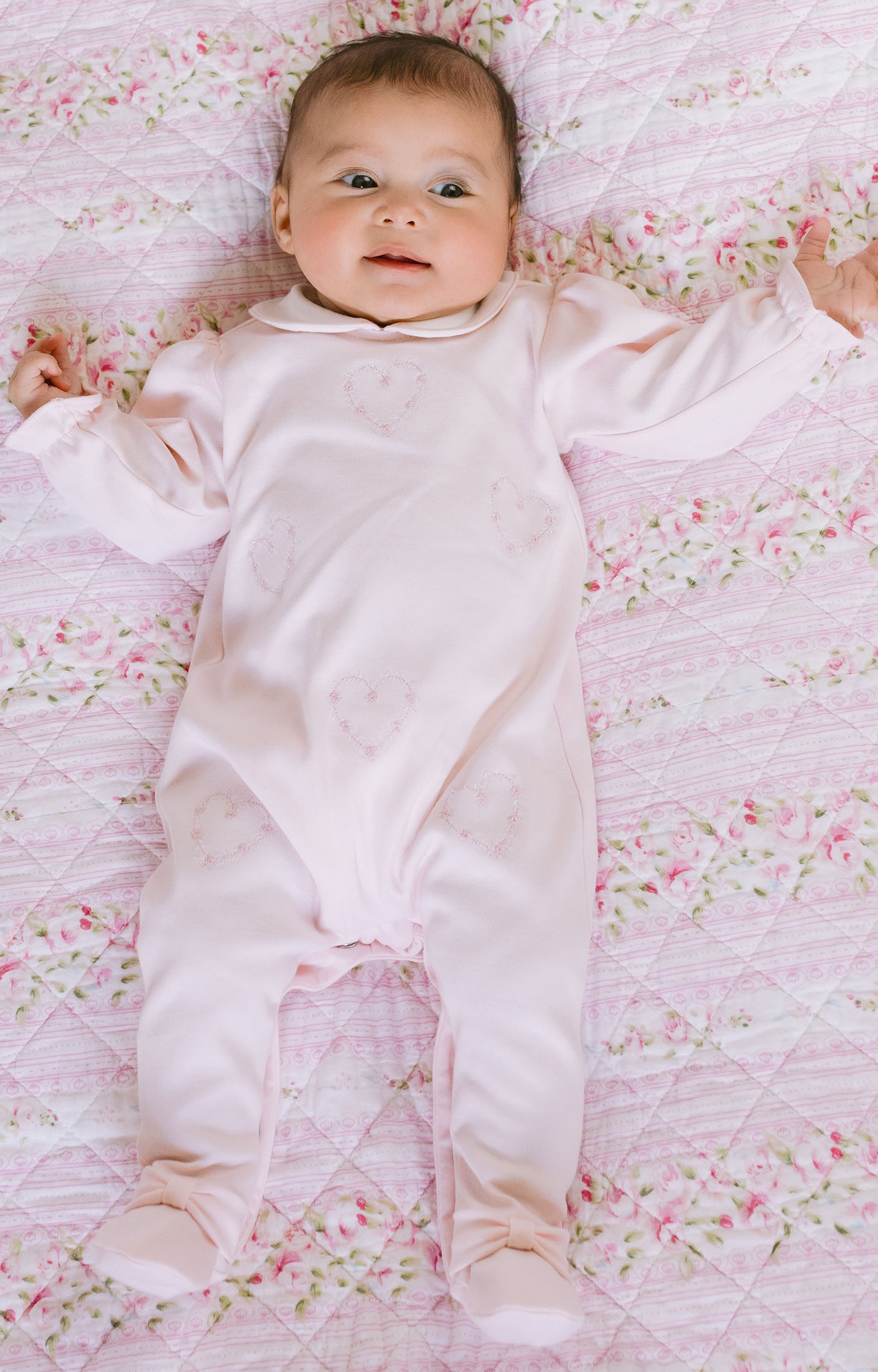 Jenna is a lovely baby girls pink babygrow with beautiful all over embroidered floral hearts. A soft rounded collar with pink piped edge, gathered sleeves and knotted bow detail at the feet, complete this stylish garment perfect for new baby.