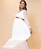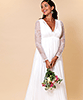 Designed with a blend of soft stretch lace across the bodice and full-length sleeves, this new bridal gown features a plunging v-neckline outlined in satin binding for dramatic effect. The crinkle chiffon skirt is gathered across the empire line and falls in swathes into a fabulously full and swishy skirt.
