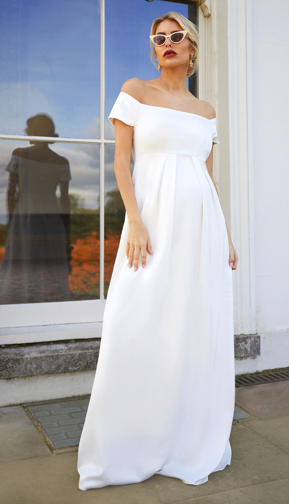 För skärmsirenglamour med ett verkligt tidlöst tilltal, är vår off-the-shoulder gravidklänning elegant och smickrande. Med smart placerade veck över buken och dolda fickor på sidan kommer du att se ut som en miljon dollar i Aria.