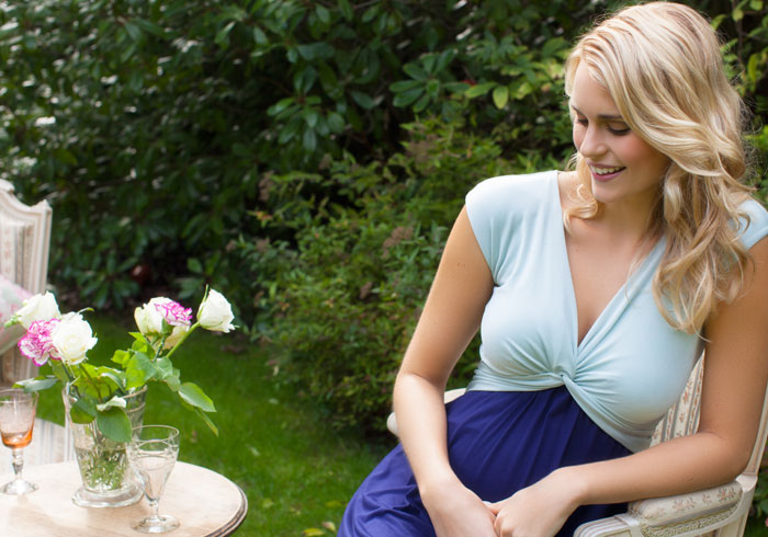The soft acetate jersey bodice is so liberating, perfect to accommodate your voluptuous curves through your pregnancy and beyond.