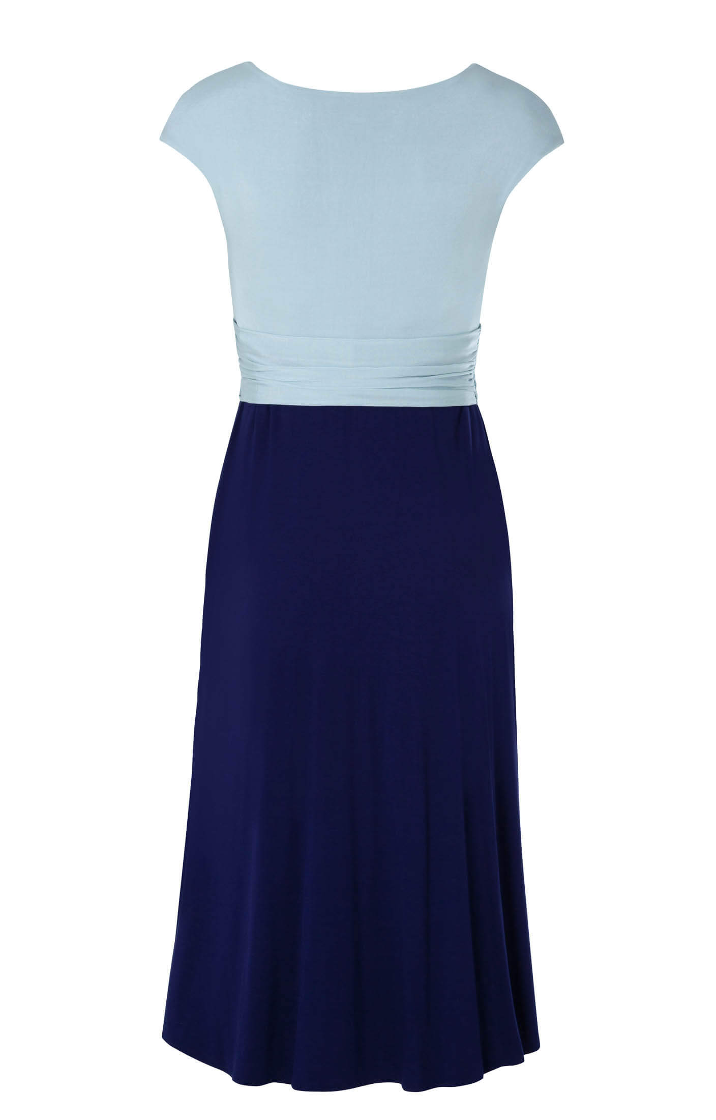 Contrasting shades of blue in bold colour block complement all the most flattering features of sublimely comfortable Clara soft jersey maternity day dress.