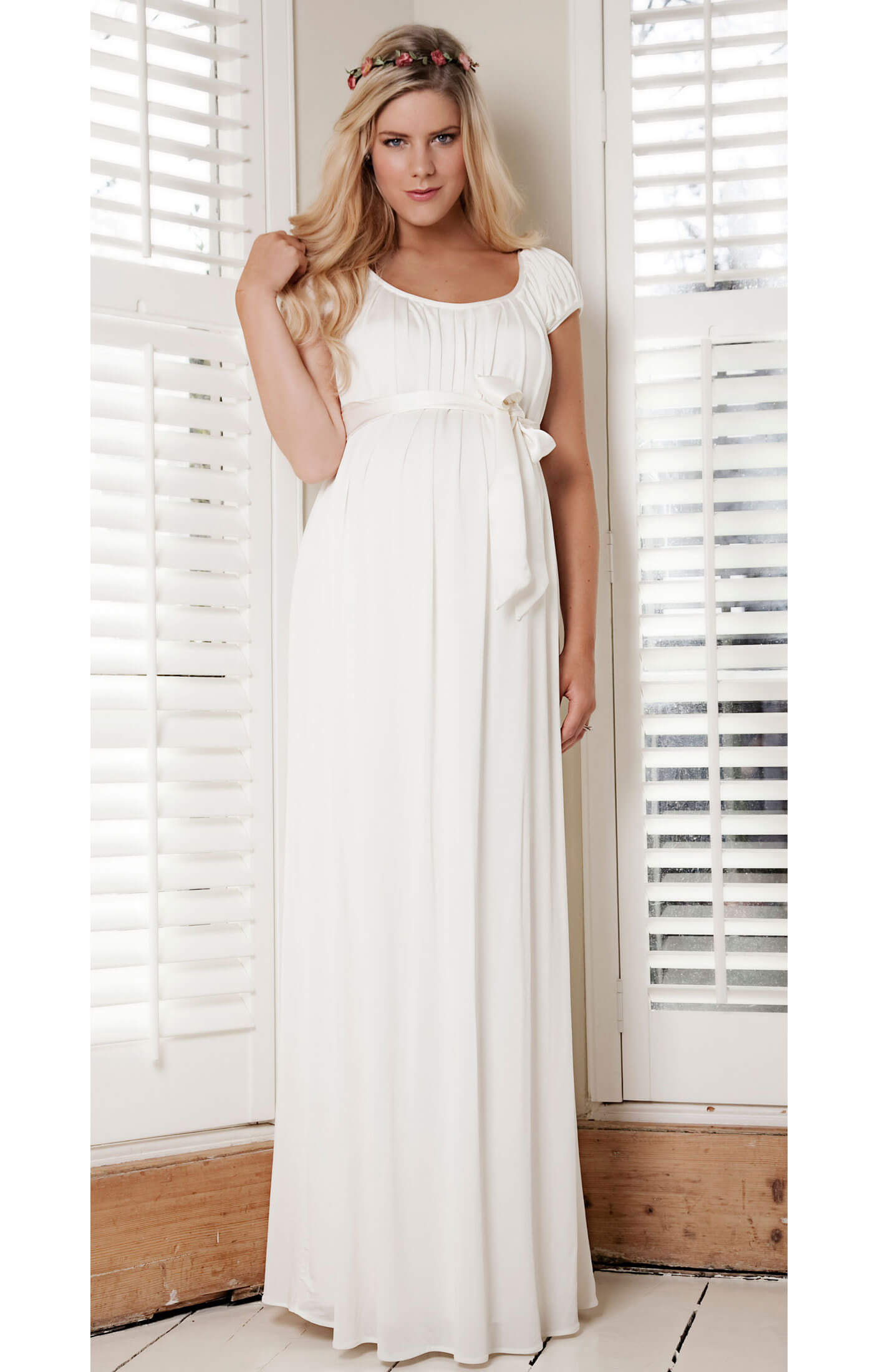 The beauty is in the simplicity of this elegant maternity wedding dress. Introducing dreamy Claudia with her elegantly pleated bodice and full length skirt in ivory.