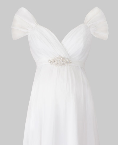 The intricately gathered cross-over neckline is flattering and sensuous with detachable silk ivory ties to tie up above bump or to the side in a bow.