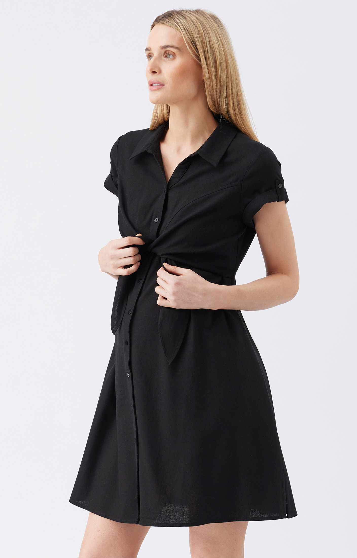Ease into summer in the Colette Tie Up Dress. Cut from a soft breathable viscose linen, this daytime dress features an A-line silhouette and a nursing friendly button through placket.