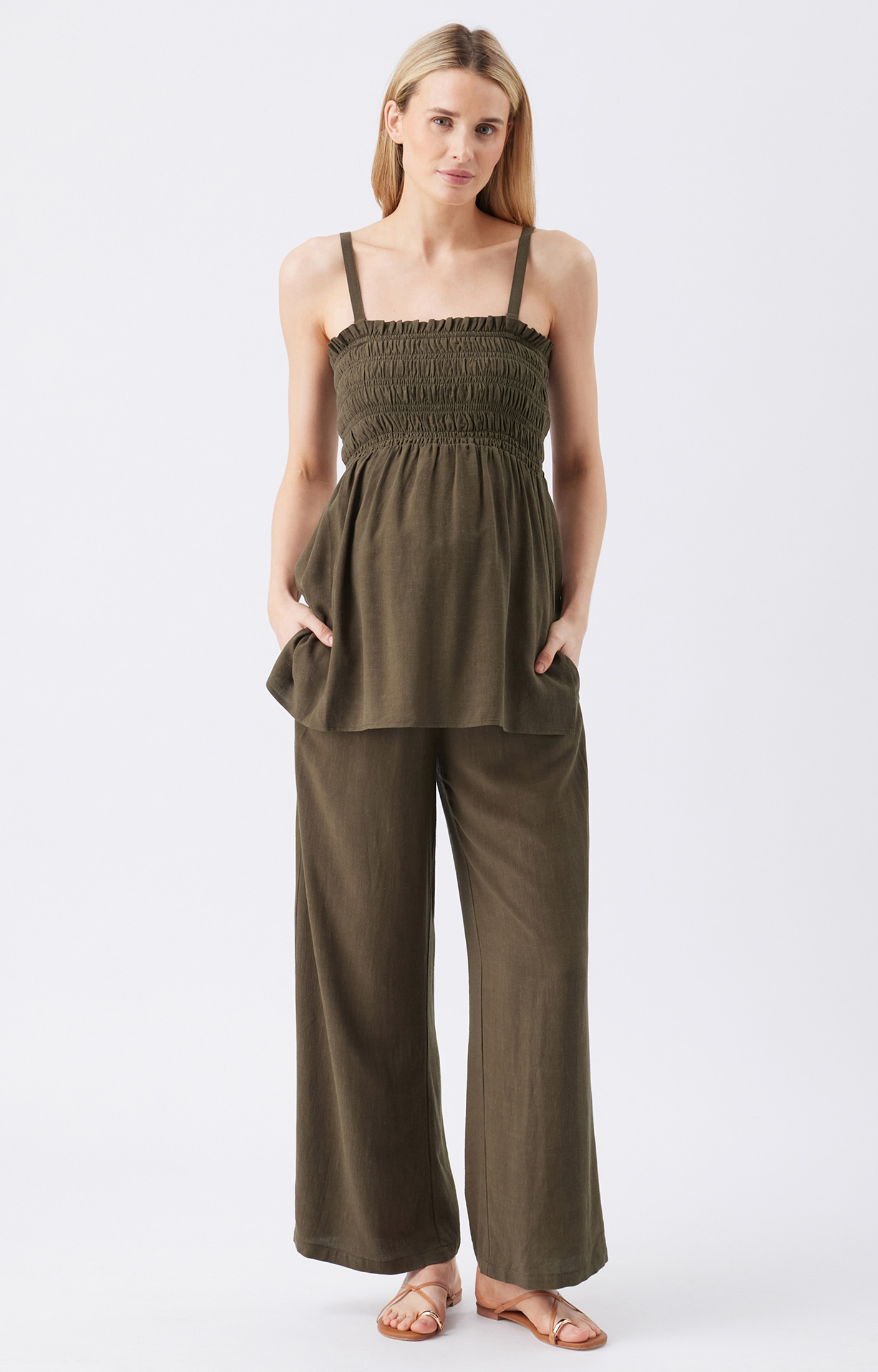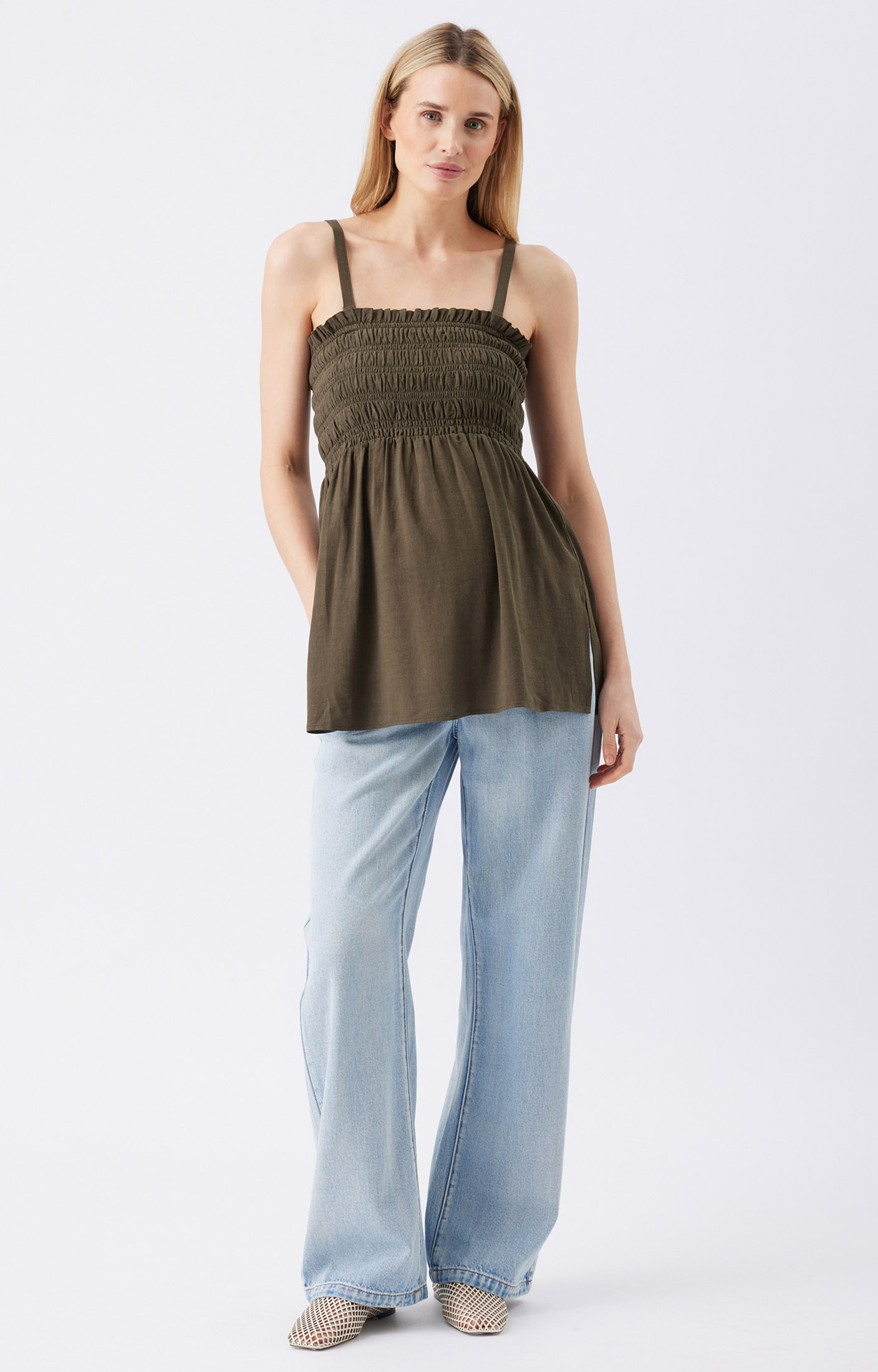 Keep it easy and breezy with the Ella Shirred Tunic. Made from a soft viscose and linen blend, it features a stretchy shirred bodice that flows into a relaxed fit at the hips. The straight neckline includes adjustable, removable straps so you can wear it your way. Side splits allow for the perfect fit as your bump grows. Perfect for warm days and casual outings, pair it with our Marlo Pull-On Pant or your favourite jeans for an effortlessly cool summer look.