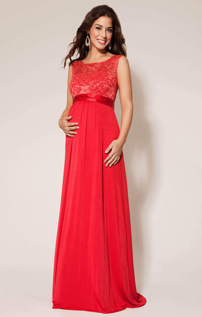 Be the lady in red who garners every glance at a gala occasion with the stunning new Sunset Red version of our ultimate glamour Valencia long maternity gown.