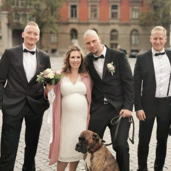Last up on our Tiffany Rose dog tour around the world, we head to Germany! Bride Nora (who wears the Suzie dress) and her other half complete their groomsmen line up with their lovely 4-legged friend! After all, they are a man's best friend…