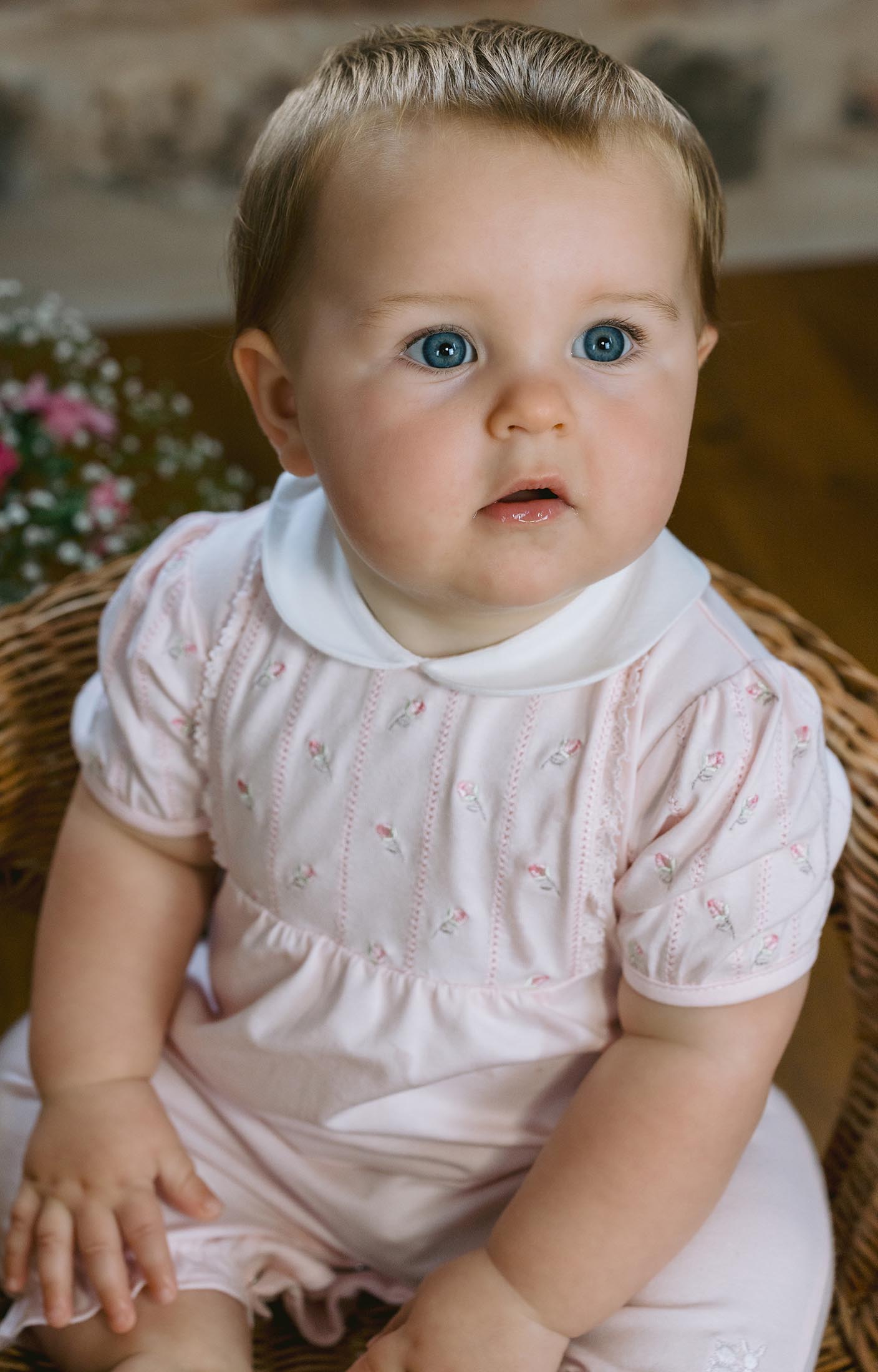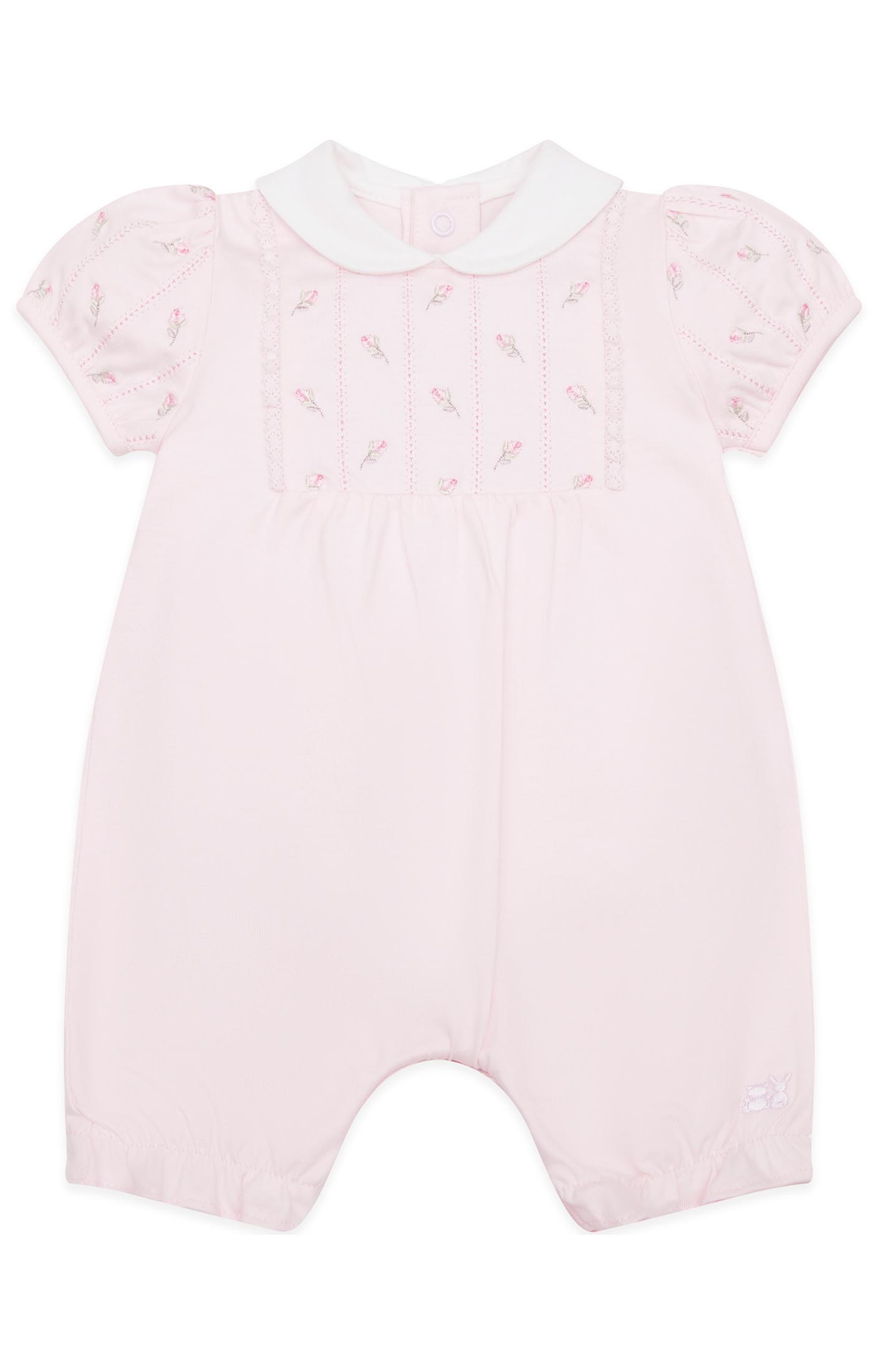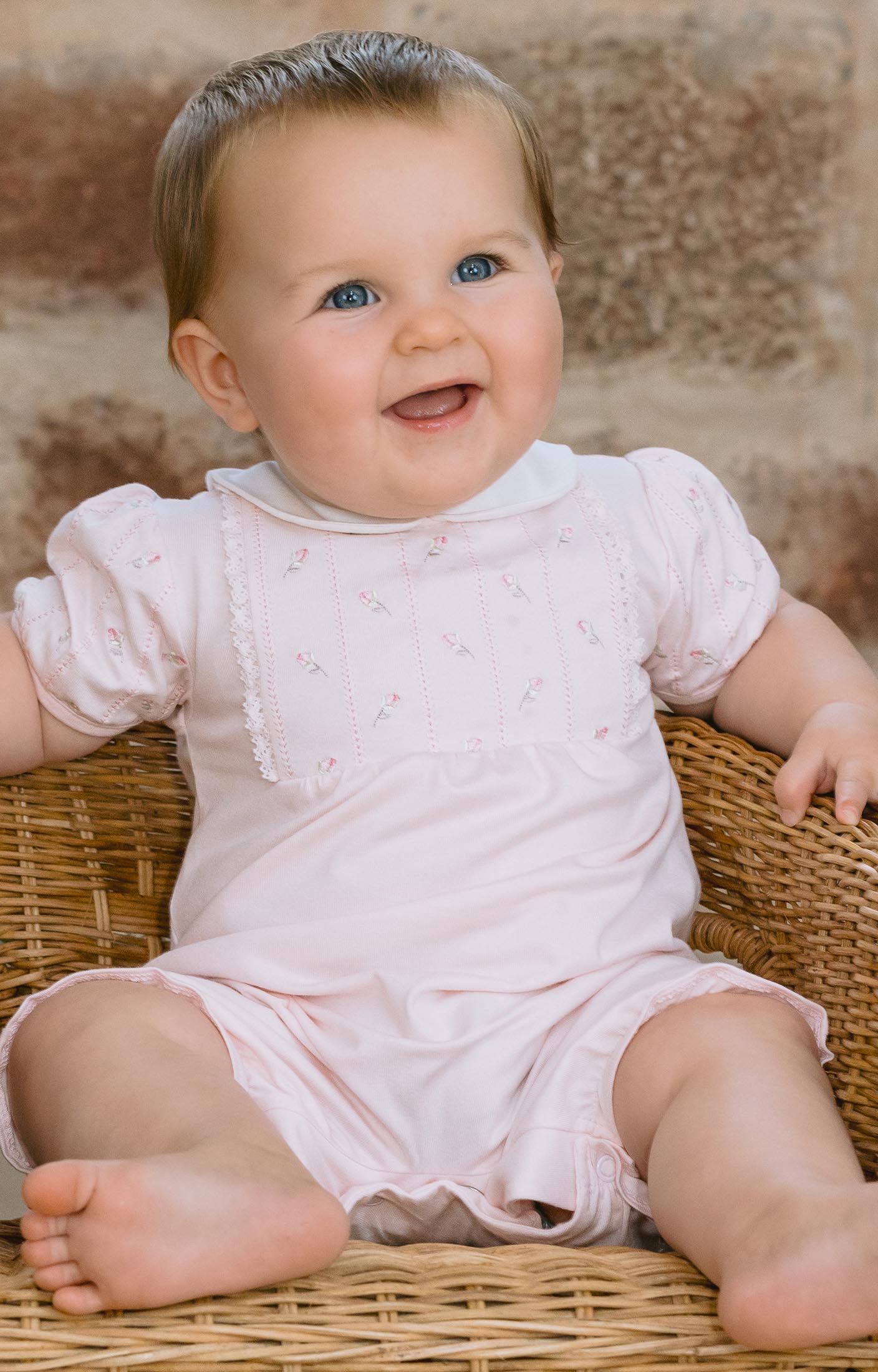 Julie is a gorgeous romper option for this summer. This romper has the same feather stitch and rosebud embroideries to the sleeves. This continues on the square inset panel on the yoke, trimmed with delicate lace. A rounded white collar and leg frills add lovely finishing touches to the pretty romper.